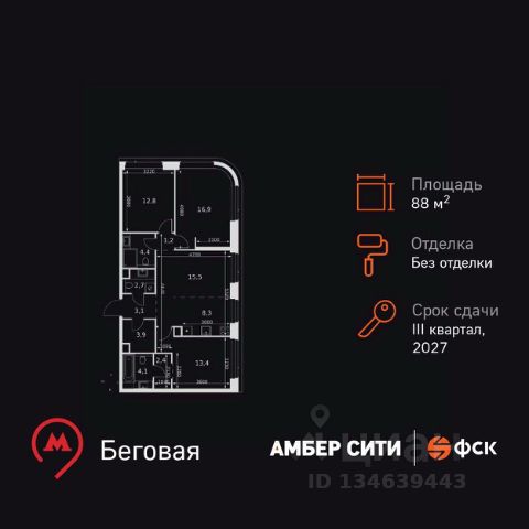 Цена указана с учётом скидки при 100%-й оплате, несубсидированной ипотеке, рассрочке (кроме программы "Рассрочка 0%"). В жилом квартале продаётся 4-комнатная квартира площадью 96.80 кв.м white box. Квартира расположена на 48 этаже 48 этажного корпуса 1 в жилом комплексе комфорт класса Левел Звенигородская (компания Level Group/Левел групп). Отличная транспортная доступность - 5 мин. пешком до метро "Звенигородская" (откроется к окончанию строительства); - 18 мин. пешком до станции МЦК "Хорошёво" и станции БКЛ "Народное ополчение"; - 4 мин. на авто до ТТК; - 8 мин. на авто до Садового кольца; - 15 мин. на авто до Кремля. Продуманный архитектурный проект - Концепция от студии Станислава Михаловского, в основу которой легло единение природы и города; - Двухкамерные стеклопакеты в окнах, алюминиевый и ПВХ профиль - в квартирах тепло зимой и прохладно летом; - С верхних этажей откроются панорамные виды на город, Москву-реку, "Москва-Сити" и Москворецкий парк; - Лобби со всеми удобствами: окна в пол, высокие потолки до 4,7 м, лаунж-зоны, колясочные, гостевые санузлы и мойки для лап животных; - Централизованные водонагреватели гарантируют круглогодичную подачу горячей воды в каждую квартиру. Благоустройство Концепция благоустройства разработана совместно с бюро UNK landscape. Высота башен приближается к 200 метрам - они словно касаются неба. Небесный простор проецируется на территорию двора с помощью подсветки, визуально увеличивая пространство и отражаясь в авторских элементах архитектуры. На территории площадью 0,45 га расположатся: - "Облако событий" - место встреч и общения; - "Облако спорта" - всё для поддержания себя в форме; - "Облако принятия решений" - пространство для работы на свежем воздухе; - "Облако спокойствия" - для отдыха в тишине природы; - "Облако игр" - площадки для подростков и самых маленьких. Инфраструктура В жилом комплексе откроется 21 коммерческое помещение: продуктовые лавки, кафе, салоны красоты, службы доставки и творческие студии. Этап 1 включает строительство двухуровневого подземного паркинга. Всего здесь расположится 351 машино-место, включая семейные места, и 264 кладовых помещения. В распоряжении жителей развитая инфраструктура района: 15 супермаркетов, 5 спортивных объектов, 9 медучреждений, 7 детских садов, 4 школы, 3 благоустроенных парка - всё в шаговой доступности. Инженерия Комфортное перемещение внутри домов будут обеспечивать надёжные лифты с доступом в паркинг с жилых этажей. В каждом корпусе предусмотрено до шести кабин, включая сервисные лифты. Попасть на территорию комплекса можно только по единому ключу доступа. Видеонаблюдение установлено на входах в подъезды, в лобби, в общих зонах, на въезде в паркинг. Гости смогут связаться с жителями дома через входные видеопанели, а управлять доступом на территорию можно через видеодомофон или приложение на телефоне.