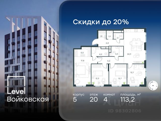 Цена указана с учётом скидки при 100%-й оплате, несубсидированной ипотеке, рассрочке (кроме программы "Рассрочка 0%"). Продается 4-комнатная квартира площадью 113.20 кв. м без отделки. Квартира находится на 20 этаже 20-этажного корпуса 5, в новом жилом комплексе бизнес-класса Level Войковская, расположенном рядом с живописным заповедником "Покровское-Стрешнево" (застройщик - компания Level Group/Левел групп). Прекрасная транспортная доступность - 7 мин. пешком до станции МЦК "Балтийская"; - 15 мин. пешком до станции метро "Войковская"; - 8 мин. на машине до ТТК; - 15 мин. на машине до центра Москвы; - 20 мин. на машине до Москва-Сити. Продуманный архитектурный проект - стильная архитектура от мастерской Фефелова В. В.; - панорамные виды на парки, Химкинское водохранилище и Останкинскую башню; - лобби с высотой потолков до 6,45 метров; - более 20 видов планировочных решений, включая редкие форматы квартир с террасой и увеличенной высотой потолков до 5,42 метров; - 2 варианта дизайнерской отделки в корпусе 4, предлагаются как дополнительная опция к отделке white box: стиль Modern в светлых холодных тонах и стиль Classic в нейтральной бежевой гамме. Квартиры в корпусах 3 и 5 сдаются без отделки. Расположение Level Войковская строится в престижном Северном округе Москвы. Развитая инфраструктура и живописная природа переплетаются в единый ансамбль, столь значимый для комфортной жизни. Войковский район окружают парки и набережные. В шаговой доступности - парк "Покровское-Стрешнево", не более 15-ти минут на велосипеде занимает путь до Тимирязевского парка и 9-ти минут до парка усадьбы Михалково. Рядом более 60 школ, 75 дошкольных учреждений, 17 государственных и 6 частных вузов, 25 супермаркетов, 4 торговых центра, среди которых ТЦ "Метрополис" и ТЦ "Авиапарк". Внутренняя инфраструктура На территории жилого комплекса предусмотрены коммерческие помещения: кафе, ресторан, пекарня и другие сервисы откроются на первых этажах корпусов. Для жителей будет доступен отапливаемый подземный паркинг на 244 машино-места с доступом с любого этажа на лифте. На территории паркинга будет расположено 125 кладовых помещений для хранения сезонного инвентаря. Лобби и благоустройство Дизайн лобби Level Войковская создан совместно с бюро BLANK. Это уютные гостиные, где хочется задержаться. Теплая цветовая гамма, ресепшен, зоны ожидания, лапомойки и гостевые санузлы - каждая деталь превращает лобби в комфортное продолжение вашего дома. 1,15 га площади в первых двух этапах строительства отведено под приватный внутренний двор, который спроектирован совместно с бюро "Правда". Детские площадки для всех возрастов, спортивные пространства для йоги, воркаута и петанка, уютные зоны для тихого отдыха или работы. Здесь утро начинается с вдохновения, а вечер наполнен приятными моментами. Лифты Комфортное перемещение внутри жилого комплекса будут обеспечивать надёжные лифты с доступом в паркинг с жилых этажей. В каждом корпусе предусмотрено по 3 грузопассажирских лифта.