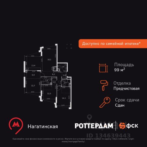 Планировка: кухня-гостиная, три изолированные комнаты, два полноценных санузла, просторный холл и коридор, общая площадь по ЕГРН - 100,8 кв.м. Широкие панорамные окна до пола обеспечивают великолепные виды на окружающий пейзаж, на парки и пойму Москвы-реки.