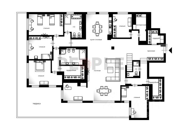 Функциональная планировка квартиры, разработанная по индивидуальному дизайн-проекту: квартира разбита на общую, взрослую и детскую зоны. В общей зоне просторная кухня-гостиная, постирочная комната, гостевой санузел, просторный холл с гардеробной. Во взрослой зоне расположены спальня с гардеробной комнатой, взрослый совмещенный санузел с ванной, душевой и двумя раковинами, кабинет. В детской зоне - три изолированные детские комнаты, две из них с выходом на балкон, совмещенный санузел с джакузи, душевой кабиной и тремя раковинами для каждого ребенка, уютная ТВ-зона с диваном, гардеробная зона с зеркальными шкафами.
