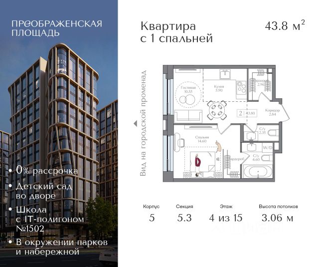Рассрочка 0% от застройщика. Первоначальный взнос от 20%. Предложение действует до 31 декабря 2025 года Квартира на 17 этаже в жилом комплексе премиум-класса "Преображенская площадь". Общая площадь: 119.8 кв.м. Проект премиум-класса в историческом районе Москвы. До метро "Преображенская площадь" 3 минуты пешком. Квартиры сдаются без отделки и в свободной планировке, чтобы жители могли оформить пространство с учетом своей индивидуальности. Высота потолков от 3,15м, широкоформатное остекление, 3-5 квартир на этаже. Система Умный дом. Дизайнерские лобби. Внутренний двор 1,5 га функциональное и безопасное пространство для игр, работы и занятий спортом. Пешеходный променад для прогулок. Дома переменной этажности. Есть подземный паркинг. Жилой комлекс находится в окружении парков Сокольники, Черкизовский, Измайловский, заповедника Лосиный остров и ВДНХ, а также вблизи пешеходной набережной. Комфортная удаленность от центра: 7 минут на автомобиле до ТТК, 8 минут до Садового кольца, 25 минут до Кремля.