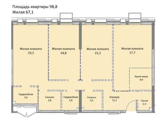 Квартира площадью 109 м2, в том числе первый уровень 72м2, второй жилой 28 м2. что позволяет реализовать: кухню-гостиную со вторым светом площадью 35м2, две спальни (14м2+10,3м2) на первом этаже и две спальни-антресоли (12,9м2+7,7м2) на втором этаже с выделенными гардеробными и рабочими зонами, два санузла (на первом этаже и антресольный), кладовка под потолком над прихожей размером 10м2. (высота 165-175 см.).