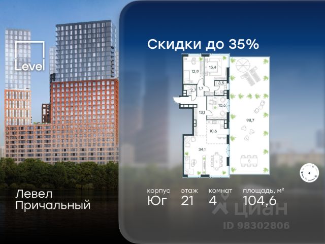 Цена указана с учётом скидки при 100%-й оплате, несубсидированной ипотеке, рассрочке (кроме программы "Рассрочка 0%"). Ключи в момент покупки! Квартира с террасой! В готовом жилом комплексе на набережной Москвы-реки продается 4-комнатная квартира площадью 104,6 кв.м без отделки. Квартира расположена на 21 этаже 32 этажного корпуса " Юг" в жилом комплексе бизнес-класса Левел Причальный (компания Level Group/Левел групп). Возможность купить машино-место в подземном паркинге. Отличная транспортная доступность - 7 мин. пешком до станции метро и МЦК "Шелепиха"; - 5 мин. на авто до ТТК; - 10 мин. на авто до Москва-Сити; - 13 мин. на авто до Садового кольца. Продуманный архитектурный проект - концепция от архитектурного бюро "Остоженка"; - окна высотой до 3,03 м и шириной до 4,3 м; - виды на МГУ, Москва-Сити, высотки на Смоленской и Кудринской площадях; - квартиры сдаются без отделки - отличный вариант для создания уникального интерьера. Технологии и безопасность - система приточной вентиляции обеспечит свежий воздух в квартирах; - собственные центральные водонагреватели - гарантия горячей воды в каждой квартире круглый год; - единый ключ доступа по всей территории ЖК; - высокоскоростные лифты OTIS. Благоустройство Дизайн внутренней территории жилого комплекса Левел Причальный разработан совместно со студией UpLand. Это уникальный двухуровневый двор с пространством для жителей любого возраста. Концепция игрового пространства верхнего яруса - каникулы на морском побережье. Дети постарше будут в восторге от большого скалодрома и песочницы-пляжа площадью 280 м², а для малышей - безопасная площадка с фигурой кита-полосатика по центру. Верхний и нижний уровни двора соединяет 90-метровый мост-пергола. Дети смогут спускаться с него по горкам, будто ныряя в пучину океана. На нижнем уровне всё располагает к размеренному отдыху: прогулкам, беседам, релаксу на шезлонгах, творческим вечерам в амфитеатре или командным активностям с соседями. Все общественные зоны жилого комплекса, включая двор и лобби, имеют доступ к сети Wi-Fi. Внутренняя инфраструктура В жилом комплексе предусмотрен собственный торговый центр, супермаркет, фитнес-зал и другие сервисы. Просторные входные группы с потолками до 4,4 м подчёркивают статусность дома. Для удобства предусмотрены мойки для лап животных, кладовые, гостевые санузлы и теплый подземный паркинг на 694 машино-места. Инфраструктура района Жилой комплекс Левел Причальный расположен в районе Хорошёво-Мнёвники, одном из самых экологически чистых и престижных районов СЗАО Москвы. В 15-минутной доступности на авто - 50 детских садов, 22 школы, 5 торговых центров, десятки супермаркетов и фитнес-клубов. И совсем скоро Шелепихинская набережная, на которой расположен жилой комплекс, приобретет новый облик и станет одним из главных мест притяжения резидентов Левел Причальный. 4-комнатная квартира в готовой новостройке в районе Хорошево-Мневники в Москве.