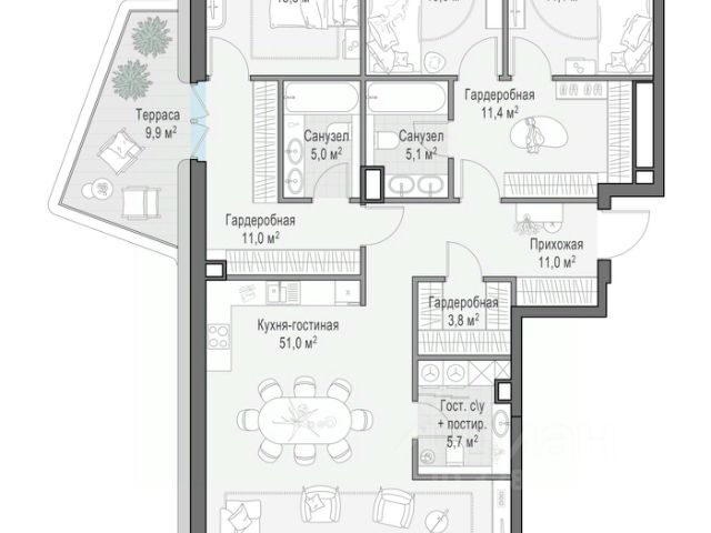 Продаётся 4 - комнатный пентхаус в готовом доме (Корпус 4.1), общей площадью 359.5 кв.м., на 21 этаже. О жилом комплексе Жилой квартал Лаки - это переосмысление и регенерация общественно-делового кластера площадью более 4.5 гектаров в центре Москвы. О застройщике Девелопер проекта Веспер специализируется в премиальном сегменте клубной жилой недвижимости. Портфель компании включает 22 проекта в Москве и странах Европы. Актуальные архитектурные проекты, индивидуальный дизайн, передовые технологии, качественные материалы и лучшие мировые практики воплощены в каждом доме компании. Расположение и транспортная доступность Квартал расположен на пересечении улиц 2-ая Звенигородская и Костикова, в 200 метрах от метро "Улица 1905 года". В непосредственной близости от парков, Москвы-реки, Сити и Садового кольца формируется идеальная среда для семейного проживания в мегаполисе. Архитектура Визуально квартал разделен на две части: верхний город с новыми высотными жилыми домами и нижний город с общественным пространством для инфраструктуры, где располагается новый социокультурный кластер площадью около 10 000 кв. м. Верхний город состоит из восьми жилых домов: семь 21-этажных башен и одно здание высотой 15 этажей. В восьми новых домах расположены 618 квартир. На каждом этаже 3-4 квартиры, большая часть которых имеет ориентацию на 2-3 стороны света. Из панорамных окон открываются виды на набережную Москва-реки, Сити и близлежащие парки. Знаковая архитектура, продуманные планировочные решения, изысканная отделка, инновационные инженерные решения воплощены в квартале Лаки. Инфраструктура В квартале представлена инфраструктура для всей семьи: парки и скверы, билингвальный детский сад Ля Березка, собственный 600 м. игровой парк для детей, фитнес с подогреваемым бассейном на крыше, рестораны, кафе и магазины органических продуктов. В шаговой доступности от квартала расположены лучшие рейтинговые школы. Купить 4-комнатную квартиру в новостройке рядом с метро Баррикадная.
