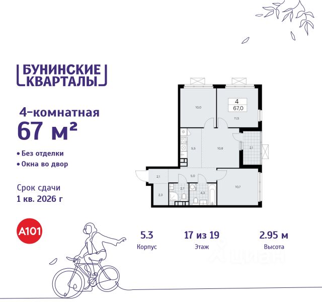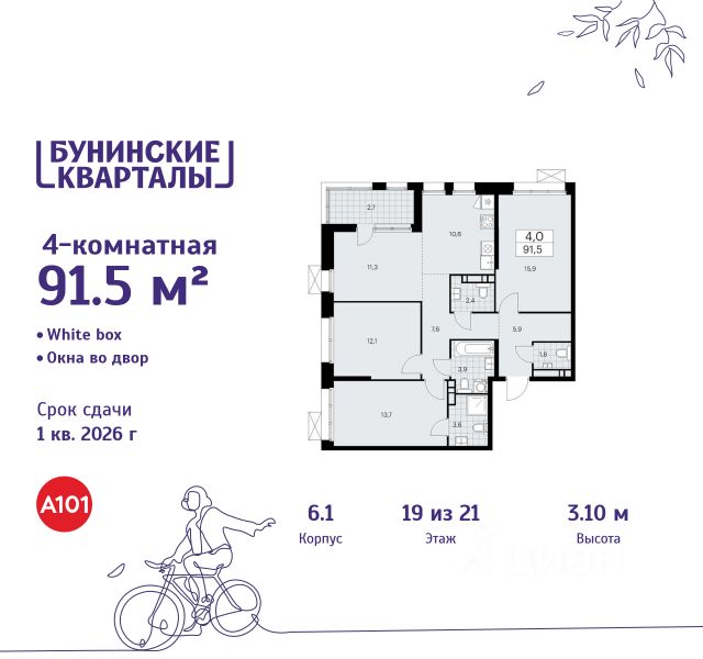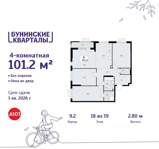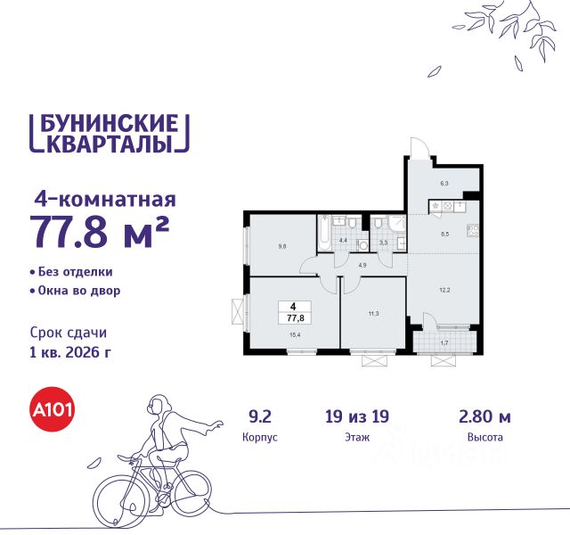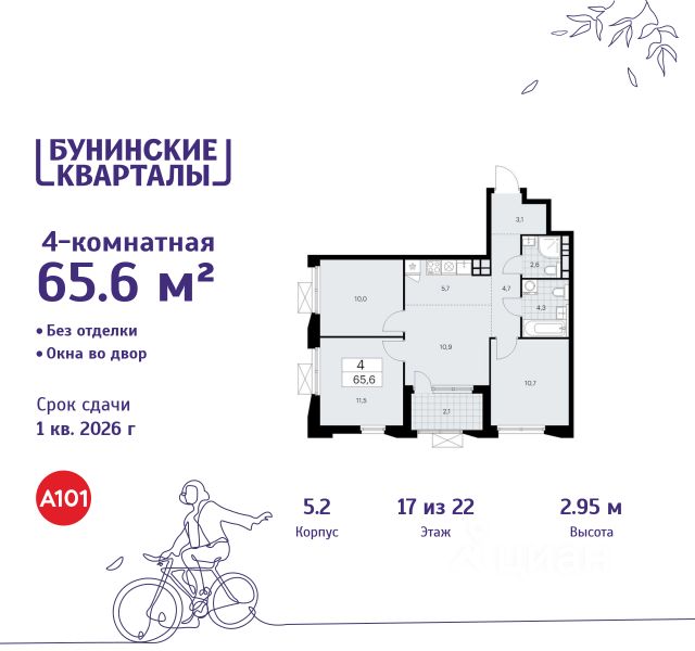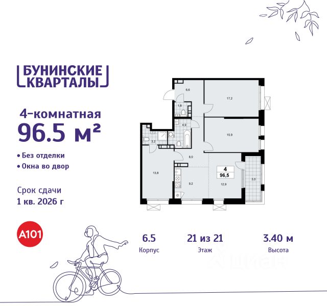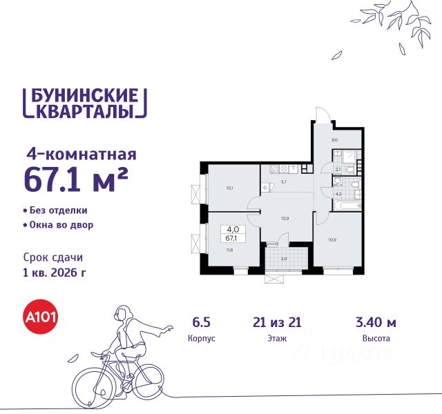 Продается четырехкомнатная квартира 616 в новостройке ЖК "Бунинские кварталы" по адресу Москва, ТиНАО, Новомосковский АО, Сосенское С/П, Москва, Новомосковский административный округ, район Коммунарка, проспект Куприна, 9к1. Общая площадь квартиры - 65.60 кв. м., этаж 17 из 22, секция 8. Тип проекта, по которому построен дом - монолит, компания-застройщик - ООО "А101". Стоимость квартиры - 22900960 Р. Срок сдачи - 2 квартал 2026. ПРЕДЛОЖЕНИЯ ОТ ЗАСТРОЙЩИКА В ФЕВРАЛЕ 2026: Скидки до 10% на все квартиры. Только в офисах продаж до 28 февраля. Ипотека от 13,9 % для всех! На весь срок. "Семейная ипотека" вернулась. Ставка от 3,5 % на весь срок! Без удорожания! Выгодное ипотечное комбо: Ипотека от 2200 р./мес. и от 6 % после рождения ребёнка! Ипотека для всех "Держи пять!" - ставка 5 % на 2 года! *более подробную информацию по скидкам и акциям уточняйте в отделе продаж ЖК "Бунинские кварталы" строится на юго-западе Москвы. Монолитные дома в лаконичной стилистике гармонируют с живописной природой. Из любой точки района удобно добираться до природных объектов, ключевых транспортных узлов, крупных торговых, спортивных, деловых и медицинских центров. Концепция уникального благоустройства района - "Выходи гулять!". Здесь появятся эстрада для районных творческих мероприятий, спортивные и игровые площадки, скейт-парк, дружелюбные пространства для домашних питомцев, благоустроенная набережная Ивановского пруда. В районе формируется собственная развитая инфраструктура: современные школа на 1100 мест и 2 детских сада на 540 малышей, магазины у дома и сетевые супермаркеты, фитнес, кафе, салоны, детские развивающие центры. Крытый каток "Самолёт Арена" - в 10 минутах пешком. За 15 минут можно дойти до действующей станции метро "Потапово". Предусмотрены удобные автомобильные выезды на проспект Куприна и улицу Александры Монаховой. Особенности "Бунинских кварталов": - ст. метро "Потапово" - 15 минут пешком - своя школа и детские сады - безопасные дворы без машин с системой контроля доступа - насыщенная инфраструктура - в шаговой доступности и на первых этажах домов 4-комнатная квартира в новостройке рядом с метро Бунинская аллея.
