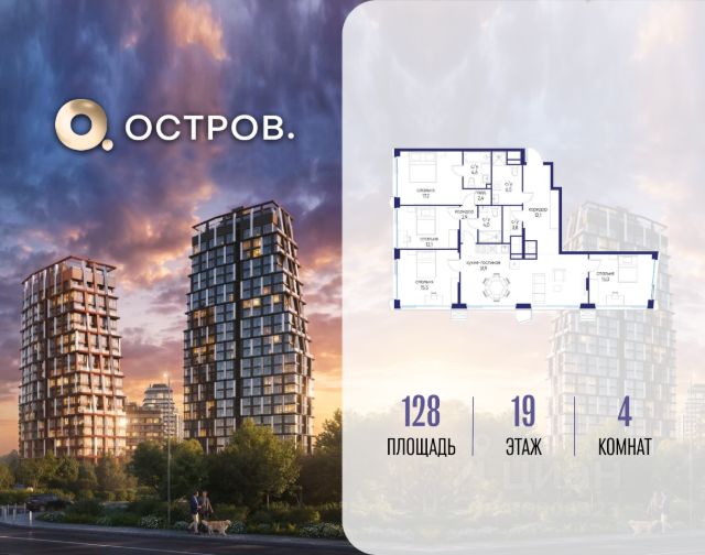Продаётся 4-комн. квартира от застройщика: общая площадь 128.00 м², жилая 59.80 м², кухня 31.90 м², 19-й этаж, жилой квартал "Остров 14", корпус 6 (секция 1). Срок сдачи: 2 квартал 2029 года. 4 санузла (1 раздельный и 3 совмещенных). Остров.14 - ЧАСТЬ ПРОЕКТА "ОСТРОВ", В 10 МИНУТАХ ОТ МОСКВА-СИТИ, В 15 МИНУТАХ ЕЗДЫ ОТ САДОВОГО КОЛЬЦА. Квартал расположен в северной части ОСТРОВА, у реки. Близость воды, благоустроенная набережная и курортная инфраструктура создают здесь отпускное настроение. Из окон квартир, с балконов и террас открываются великолепные виды на реку и московские пейзажи. Для семей с детьми предусмотрен дополнительный бонус: детский сад и школа в двух шагах от дома.