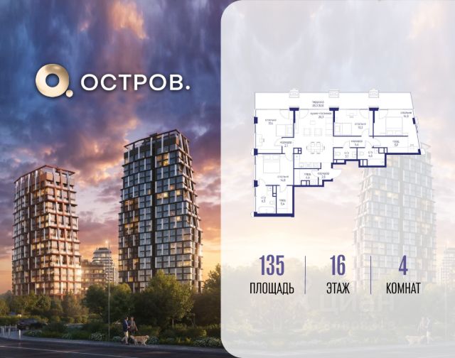 Продаётся 4-комн. квартира от застройщика: общая площадь 135.00 м², жилая 60.30 м², кухня 26.30 м², 16-й этаж, жилой квартал "Остров 14", корпус 6 (секция 1). Срок сдачи: 2 квартал 2029 года. 3 санузла (1 раздельный и 2 совмещенных). Остров.14 - ЧАСТЬ ПРОЕКТА "ОСТРОВ", В 10 МИНУТАХ ОТ МОСКВА-СИТИ, В 15 МИНУТАХ ЕЗДЫ ОТ САДОВОГО КОЛЬЦА. Квартал расположен в северной части ОСТРОВА, у реки. Близость воды, благоустроенная набережная и курортная инфраструктура создают здесь отпускное настроение. Из окон квартир, с балконов и террас открываются великолепные виды на реку и московские пейзажи. Для семей с детьми предусмотрен дополнительный бонус: детский сад и школа в двух шагах от дома.