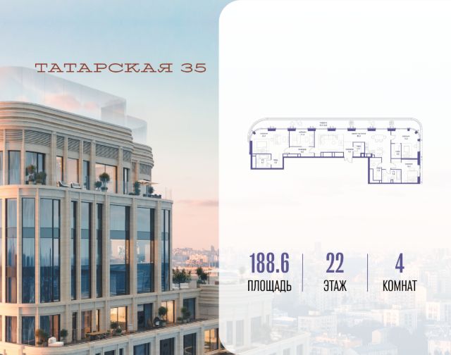 Продается просторная квартира площадью 318.60 м2 в жилом комплексе ТАТАРСКАЯ, 35. Квартира находится в 2 секции корпуса 2. Этаж 19-й из 19. Квартира без чистовой отделки, с просторной кухней 124.70 м2. Жилая площадь 93.20 м2. Высота потолка от 3.50. ТАТАРСКАЯ, 35 - новая архитектурная доминанта Замоскворечья, достопримечательность на фотопанорамах исторического центра Москвы. Элитный дом, созданный для тех, кто умеет смотреть далеко вперед, мыслить масштабно и воплощать собственный сценарий жизни. Вдохновляющие прогулки по променаду набережной, в уютных переулках, в парке "Зарядье", в Михайловском саду и Репинском сквере. Наслаждение высоким искусством в Третьяковской галерее, Доме Музыки, театральном музее им. А.А. Бахрушина, театре на Малой Ордынке. За окнами - Кремль, высотка на Котельнической, панорамы Замоскворечья и острова Балчуг, огни Садового кольца. Собственные спорт-румы, детская, репетиторская, бьюти-пространства, деловое пространство с коворкингом, переговорной и сигарной. Собственный трехуровневый фитнесс-центр с бассейном, тренажерным залом, сауной, хаммамом, массажным кабинетом. Площадь двора - 1,8 га, половина территории покрыта деревьями, кустарниками и лужайками. Дом расположен внутри Садового кольца - отсюда в считанные минуты можно добраться до важнейших мест столицы: достопримечательностей и парков, театров и ресторанов, деловых и административных центров. 7 минут до Кремля на автомобиле, 15 минут до Третьяковской галереи и 8 минут до Садового кольца пешком. Планировочные решения и визуализации предварительны, возможны изменения. 4-комнатная квартира в новостройке рядом с метро Новокузнецкая.