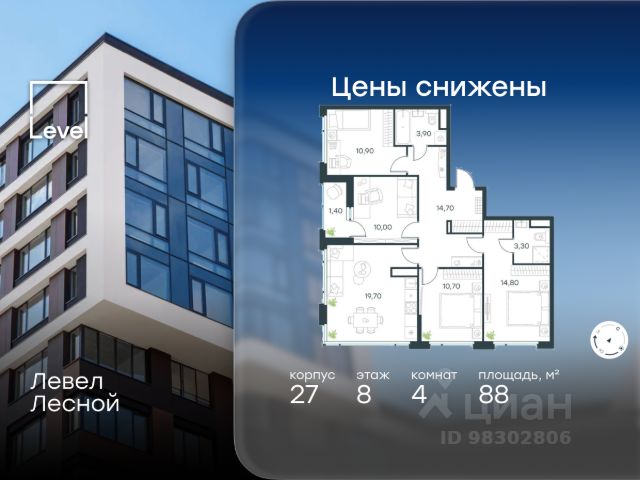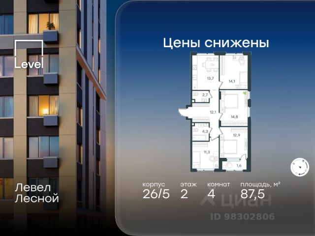 Цена указана с учётом скидки при 100%-й оплате, несубсидированной ипотеке, рассрочке (кроме программы "Рассрочка 0%"). В районе, утопающем в густой зелени лесов, многочисленных парков и скверов, продаётся 4-комнатная квартира площадью 87.70 кв.м без отделки. Квартира расположена на 3 этаже в жилом комплексе комфорт-класса Левел Лесной (компания Level Group/Левел групп). Отличная транспортная доступность: - 25 мин. пешком до станции метро "Пятницкое шоссе"; - 28 мин. на автобусе до станции метро и МЦД-2 "Волоколамская"; - 11 мин. на авто до МКАД; - 25 мин. на авто до ТТК. Продуманный архитектурный проект: - Концепция проекта Левел Лесной от бюро СПИЧ; - Высотность комплекса до 15 этажей с уникальными видами на лесные массивы и город; - Высота потолков до 3 м; - Современные окна высотой до 1,6 м, в части квартир предусмотрены окна в пол. Высота подоконников 0,6 м; Расположение: Жилой комплекс Левел Лесной строится в зелёной зоне ближайшего Подмосковья, г.о. Красногорск в посёлке Отрадное. Шаговая и автомобильная доступность до метро и больших транспортных артерий города. За 25 минут вы дойдёте до станции метро "Пятницкое шоссе", а за 20 минут на машине сможете доехать до станции метро "Тушинская". Район окружен роскошной зеленью лесов и парковых зон, занимающих территорию свыше 1 000 гектаров. Помимо благоприятной экологии, здесь множество возможностей для активного отдыха и поддержания физической формы. Облагороженная территории с полностью развитой инфраструктурой. На территории проекта находится детский сад и школа "Светлые Горы", которая входит в список лучших частных школ от Forbes Education (по данным на 2023г.). Кроме того, в пешей доступности расположено ещё 8 детских садов, а также запланировано открытие современной муниципальной школы. В непосредственной близости находятся сетевые супермаркеты и локальные магазины, аптеки, клиники, почта, библиотека, салоны красоты, рестораны, спортивные и творческие секции, развивающие детские центры. В 12 минутах пешком расположен торговый парк "Отрада" с продуктовым и строительным гипермаркетами, магазинами, кинотеатром и развлечениями для детей. Внутренняя инфраструктура: Мы знаем, как важно, чтобы магазины и сервисы были всегда рядом. В сданных корпусах жилого комплекса Левел Лесной уже расположена полностью готовая развитая инфраструктура. На первых этажах корпуса 27 предусмотрено ещё 14 коммерческих помещений. Благоустройство: Продуманное пространство и аура приватного европейского городка рождают чувство лёгкости и расслабления у каждого, кто попадает на территорию проекта. Концепцию общественных площадок разработали в партнёрстве два архитектурных бюро: "Хайлайт Архитектура" (Highlight Architecture) и "Скейп" (Scape). В безопасных дворах без машин каждый обязательно найдёт себе место для вдохновения, отдыха и спорта.