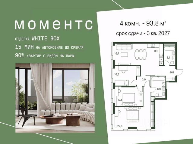 В продаже 4-комнатная квартира в готовом клубном доме бизнес-класса "Интонация". Квартира с высокими потолками с мастер-спальней, окном в ванной комнате, просторной кухней и постирочной. Условия покупки: - семейная ипотека - рассрочка на 6 месяцев - Trade-in "Интонация" состоит из двух 21-этажных корпусов и приватной внутренней территории. На стилобате расположен ландшафтный сад с авторским благоустройством. В продаже финальный пул квартир бизнес-класса с мастер-спальнями, возможностью установки камина, окнами в ванных комнатах, увеличенной высотой потолков, а также просторными террасами и лоджиями. "Интонация" расположена в экологичном районе Щукино на северо-западе Москвы. Вокруг Щукинский лесопарк, Всехсвятская роща и парк "Покровское-Стрешнево". Одно из главных преимуществ дома - сочетание близости к природе и развитой инфраструктуры: - до метро "Щукинская" - 10 минут пешком - до центра - 10 минут на автомобиле Рядом детские сады и школы, включая знаменитую Курчатовскую. Недалеко расположены корпуса Финансового университета и других ведущих вузов. В пешей доступности - поликлиники, супермаркеты, фитнес-центры и спортивные секции. Собственная инфраструктура "Интонации" - ресторан итальянской кухни, студия фитнеса и пилатеса, супермаркеты, один из которых круглосуточный, салон красоты, барбершоп и химчистка. Приватная территория "Интонации" разделена на две тематические зоны: внутренний двор с детскими и спортивными площадками и ландшафтный сад на террасе. Главным акцентом стал парящий водоем с подвижной гладью. Двухуровневый паркинг рассчитан на 186 автомобилей и 27 гостевых мест. Есть возможность зарядки электромобилей, удобный подъезд для грузового транспорта, келлеры для хранения личных вещей и помещение для велосипедов.