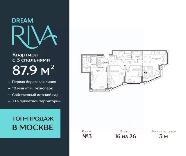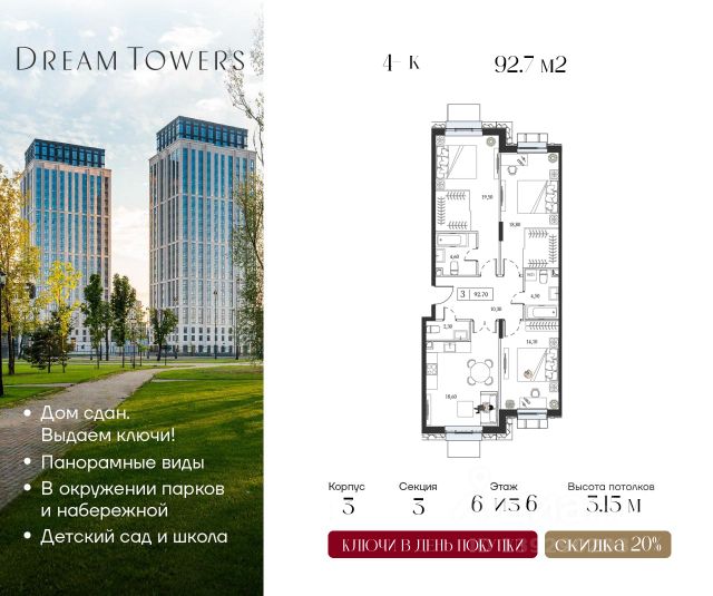 Рассрочка 0% от застройщика. Ключи в день покупки. ЖК Dream Towers — проект премиум-класса в окружении парков и набережной, с полностью готовой инфраструктурой для комфортной жизни и отдыха. Продаётся 4-квартира на 6 этаже 6-этажного дома (3 корпус). Общая площадь: 144.2 кв.м. Высота потолков от 3.15 м. Город-курорт на 100 Га в шаге от вашего дома: • пляжный комплекс Dream Beach Club; • парк аттракционов Остров Мечты; • 44 Га ландшафтных парков; • пешеходная набережная; • яхт-клуб; • Южный речной вокзал; • вейк-парк и многое другое. В Dream Towers предусмотрено все для комфортной жизни с семьей: • дизайнерские лобби с общественной гостиной, колясочной и лапомойками; • охраняемый благоустроенной двор только для жителей; • собственный десткий сад и школа прямо во дворе; • красивая архитектура зданий в стиле Ар-деко; • облицовка фасадов из натурального камня с архитектурной подсветкой; • широкоформатное остекление окон в пол для лучших видовых характеристик на парки и пойму Москвы-реки; • подземный паркинг; • клубный формат проживания; • эргономичные планировки от 40 до 162 м2; • высокие потолки от 3,15 до 4,1 м; • квартиры с террасами; • вся необходимая инфраструктура на первых этажах домов, а также в торговой частия тематического парка "Остров Мечты" (рестораны, кафе, супермаркет, магазины, салон красоты, йога-студия и многое другое). Центр рядом: 15 минут до Садового кольца на авто, 20 минут до Сити или Кремля. В 5 минутах прогулочным шагом — станция метро "Технопарк" 4-комнатная квартира в новостройке рядом с метро Технопарк.