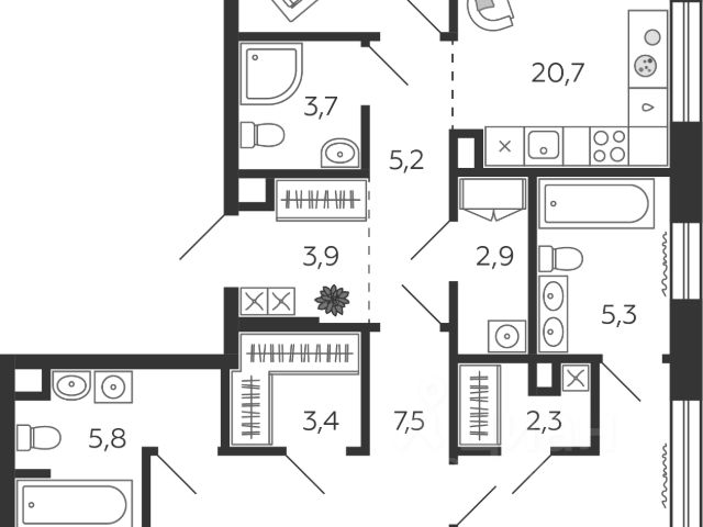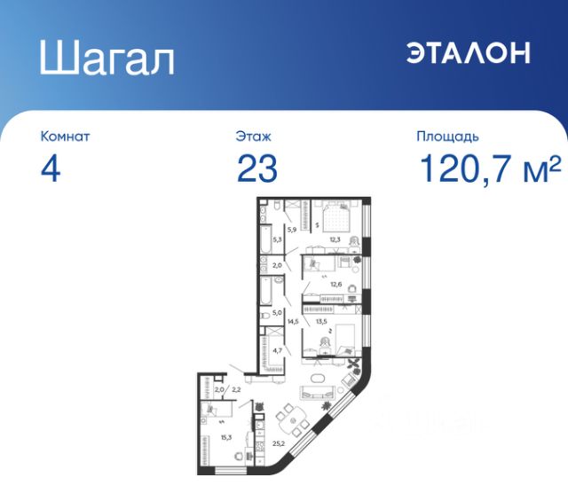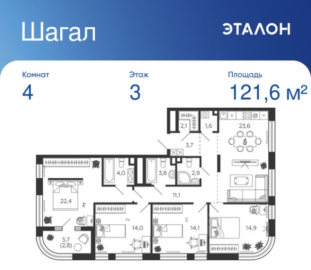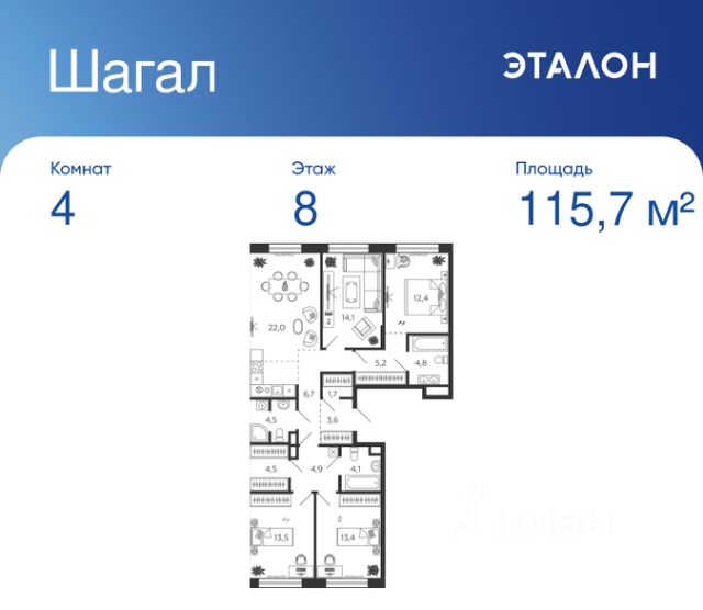 Продается 4-к квартира без отделки в ЖК "Шагал". Общая площадь квартиры — 123.7 кв. м, этаж 7 из 15. Тип дома — монолитный. Цена указана при 100% оплате. Квартал Шагал — крупнейший проект комплексного освоения в Москве. В проекте реализуется продуманная система маршрутов. Еда, покупки, услуги, прогулки, спорт, образование, работа и развлечения — все будет находиться рядом с домом: принцип 15-минутной доступности инфраструктуры и сервисов. Разнообразие и продуманность пешеходных маршрутов, а также короткие расстояния между основными точками притяжения мотивируют резидентов Шагал с удовольствием передвигаться по району пешком, не выпадая из ритма большого города. Продуманная транспортная сеть района и безопасный скоростной режим создают комфортные условия для перемещений любым способом: на автобусе, машине, самокате или велосипеде. Не нужно выезжать из района, чтобы получить комфорт и сервис самого высокого современного стандарта: все необходимые услуги, инфраструктура, парки и вторая по протяженности набережная в городе — на расстоянии 15-минутной прогулки от вашего дома. Квартал Шагал станет первым в Москве жилым районом, где будут комплексно реализованы инновационные подходы в проектировании и строительстве зданий. Архитектурная композиция состоит из домов отличающегося типа. Высотные башни-доминанты с видовыми квартирами, дома пониже, растворяющиеся в спокойствии внутренних двориков, малоэтажные камерные таунхаусы и разноэтажные дома с лоджиями на первой береговой линии соединяются в одно эстетичное современное произведение. В результате создаётся насыщенное идентичное пространство, подчёркнутое плавностью природных форм, наполненное светом, воздухом и свободой. Продам 4-комнатную квартиру в новостройке на набережной Марка Шагала в Москве.