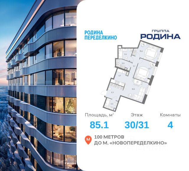 Предлагается готовая к проживанию квартира с отделкой площадью 186 м2 по такой же цене, как квартира без отделки в два раза меньшей площадью 94 м2 со сдачей в 2027 году в соседнем ЖК Родина Новопеределкино.