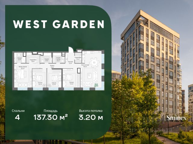 Комфортная и продуманная до мелочей 4-спальная квартира площадью 141.00 кв. м на 12 этаже в клубном доме 8. Увеличенная площадь окон и высота потолков 3.20 м дарят впечатляющие виды на парки, зеленые зоны и природные заказники. West Garden - это собрание клубных домов высотой 12-14 этажей в собственном парке 16 гектаров вдоль реки. Просторный среднеэтажный квартал расположен на Минской улице, в респектабельном Западном округе столицы. Вокруг премиальное окружение и более 1000 гектаров парков. West Garden - это возможность обеспечить себе и своей семье лучшие условия для жизни в одном из самых привлекательных и зелёных районов столицы. Гармония природы дополнена здесь впечатляющими возможностями и привилегиями: • Расположение в зелёном Западном районе столицы вблизи центра и ключевых магистралей в окружении парковых зон (заказник "Долина реки Сетунь", Мосфильмовский пруд, Ботанический сад МГУ, природный заказник "Воробьёвы Горы", Парк Победы на Поклонной горе) • Современная лаконичная архитектура, у каждого дома свой индивидуальный облик и выразительный фасад с использованием натуральных и долговечных материалов (гранит, известняк, клинкерный кирпич) • Функциональные лобби с отделкой из дерева и натурального камня с высокими потолками до 7,8 м • Самый большой собственный парк для прогулок и отдыха: 8 га собственной закрытой и благоустроенной территории, а также 8 га прилегающего парка на набережной с зонами отдыха с шезлонгами, маршрутами для бега, пеших и велосипедных прогулок • Инфраструктурный центр Clubhouse только для жителей: клубная гостиная с террасой и творческой атмосферой по фирменному стандарту Friend`s Lab, детская игровая зона 300 кв. м по стандарту Kid`s Lab • Насыщенная и разнообразная инфраструктура для детей любого возраста: 8 развивающих детских площадок в парке, 3 детские площадки на благоустроенной набережной, площадка для отдыха и досуга подростков • Спортивная инфраструктура по стандарту Fit Lab: многофункциональные площадки для футбола, баскетбола, волейбола с трибуной для болельщиков, зона воркаута, теннисные столы, зона для йоги, беговая дорожка 3 километра, фитнес-центр только для жителей • Комфортный и просторный подземный паркинг на 1313 машино-мест, 482 келлера, автомойка только для жителей на четыре поста 4-комнатная квартира в новостройке на проспекте Генерала Дорохова в Москве.