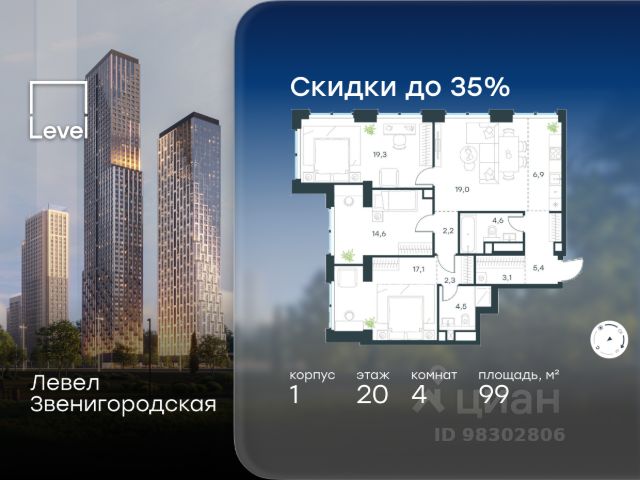 Цена указана с учётом скидки при 100%-й оплате, несубсидированной ипотеке, рассрочке (кроме программы "Рассрочка 0%"). В жилом квартале продаётся 4-комнатная квартира площадью 92.90 кв.м white box. Квартира расположена на 3 этаже 48 этажного корпуса 1 в жилом комплексе комфорт класса Левел Звенигородская (компания Level Group/Левел групп). Отличная транспортная доступность - 5 мин. пешком до метро "Звенигородская" (откроется к окончанию строительства); - 18 мин. пешком до станции МЦК "Хорошёво" и станции БКЛ "Народное ополчение"; - 4 мин. на авто до ТТК; - 8 мин. на авто до Садового кольца; - 15 мин. на авто до Кремля. Продуманный архитектурный проект - Концепция от студии Станислава Михаловского, в основу которой легло единение природы и города; - Двухкамерные стеклопакеты в окнах, алюминиевый и ПВХ профиль - в квартирах тепло зимой и прохладно летом; - С верхних этажей откроются панорамные виды на город, Москву-реку, "Москва-Сити" и Москворецкий парк; - Лобби со всеми удобствами: окна в пол, высокие потолки до 4,7 м, лаунж-зоны, колясочные, гостевые санузлы и мойки для лап животных; - Централизованные водонагреватели гарантируют круглогодичную подачу горячей воды в каждую квартиру. Благоустройство Концепция благоустройства разработана совместно с бюро UNK landscape. Высота башен приближается к 200 метрам - они словно касаются неба. Небесный простор проецируется на территорию двора с помощью подсветки, визуально увеличивая пространство и отражаясь в авторских элементах архитектуры. На территории площадью 0,45 га расположатся: - "Облако событий" - место встреч и общения; - "Облако спорта" - всё для поддержания себя в форме; - "Облако принятия решений" - пространство для работы на свежем воздухе; - "Облако спокойствия" - для отдыха в тишине природы; - "Облако игр" - площадки для подростков и самых маленьких. Инфраструктура В жилом комплексе откроется 21 коммерческое помещение: продуктовые лавки, кафе, салоны красоты, службы доставки и творческие студии. Этап 1 включает строительство двухуровневого подземного паркинга. Всего здесь расположится 351 машино-место, включая семейные места, и 264 кладовых помещения. В распоряжении жителей развитая инфраструктура района: 15 супермаркетов, 5 спортивных объектов, 9 медучреждений, 7 детских садов, 4 школы, 3 благоустроенных парка - всё в шаговой доступности. Инженерия Комфортное перемещение внутри домов будут обеспечивать надёжные лифты с доступом в паркинг с жилых этажей. В каждом корпусе предусмотрено до шести кабин, включая сервисные лифты. Попасть на территорию комплекса можно только по единому ключу доступа. Видеонаблюдение установлено на входах в подъезды, в лобби, в общих зонах, на въезде в паркинг. Гости смогут связаться с жителями дома через входные видеопанели, а управлять доступом на территорию можно через видеодомофон или приложение на телефоне.