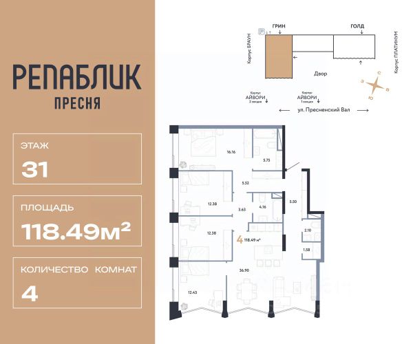 Рассрочка 0% с первым взносом от 20%, ипотека с субсидией или наличные. Подберём способ оплаты индивидуально. Продается 5комнатная квартира на 31 этаже от застройщика Страна Девелопмент. Площадь квартиры 118.49 кв. м. Дизайн-квартал "Republic" — новый проект премиум-класса в Москве от федерального застройщика "Страна Девелопмент". ЦАО, Пресня, 7 мин. от метро "Белорусская". 10 жилых башен и 4 восстановленных здания локомотивного депо образуют уникальное пространство. "Republic" — место, где вы ощутите гармонию истории и современности. За 12 мин. вы сможете дойти до Московского зоопарка, за 10 мин. на авто доехать до Патриарших прудов и Белого дома. Преимущества • Благоустройство. SPA-комплекс с бассейном и термами, гастрономический, учебный и шопинг-центры, приватный бульвар и яркие арт-пространства — для жителей предусмотрены все элементы премиального комфорта. • Панорама на центр. Наслаждайтесь видами ЦАО каждый день: панорама на историческую Пресню и башни Москва-Сити — из своей квартиры или с приватной террасы на крыше. • Концептуальное лобби в каждой башне. С общей террасой на кровле, с библиотекой, коворкингом и фитнес-рум. Стойка консьержа перетекающая в бар и др. • Современные форматы квартир. Свободные планировки, с террасой или балконом, с возможностью установки камина, от 1-комнатных до пентхаусов. • Отделка Квартиры сдаются без отделки или в формате White box. При White box уже выполнены все шумные и грязные работы: произведена разводка электричества с подрозетниками, установлены откосы из гипсокартона, устроена стяжка пола с шумоизоляцией и др. Способы покупки Сотрудники "Страна Девелопмент" будут сопровождать вас на каждом этапе сделки, помогут получить одобрение по ипотеке или снизить ежемесячный платеж. - ипотека (стандартная/с субсидией/траншевая) - рассрочка (с ПВ от 20%) - с использованием материнского капитала - оплата наличными Продам 4-комнатную квартиру в новостройке на улице Пресненский Вал в Москве.