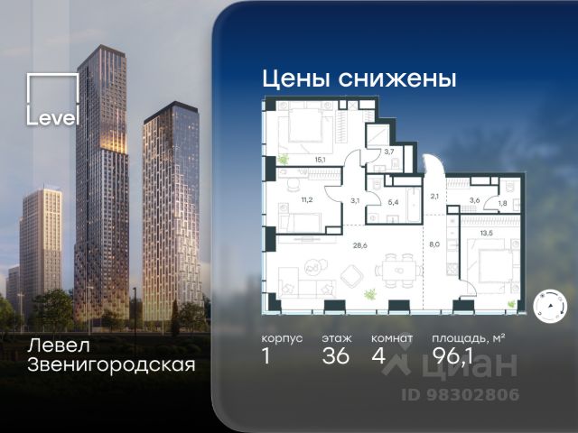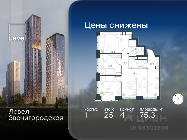 Цена указана с учётом скидки при 100%-й оплате, несубсидированной ипотеке, рассрочке (кроме программы "Рассрочка 0%"). В жилом квартале продаётся 4-комнатная квартира площадью 75.30 кв.м с предчистовой отделкой. Квартира расположена на 25 этаже 48 этажного корпуса 1 в жилом комплексе комфорт класса Левел Звенигородская (компания Level Group/Левел групп). Отличная транспортная доступность - 5 мин. пешком до метро "Звенигородская" (откроется к окончанию строительства); - 18 мин. пешком до станции МЦК "Хорошёво" и станции БКЛ "Народное ополчение"; - 4 мин. на авто до ТТК; - 8 мин. на авто до Садового кольца; - 15 мин. на авто до Кремля. Продуманный архитектурный проект - Концепция от студии Станислава Михаловского, в основу которой легло единение природы и города; - Двухкамерные стеклопакеты в окнах, алюминиевый и ПВХ профиль - в квартирах тепло зимой и прохладно летом; - С верхних этажей открываются панорамные виды на город, Москву-реку, "Москва-Сити" и Москворецкий парк; - Лобби со всеми удобствами: окна в пол, высокие потолки до 4,7 м, лаунж-зоны, колясочные, гостевые санузлы и мойки для лап животных; - Централизованные водонагреватели гарантируют круглогодичную подачу горячей воды в каждую квартиру. Благоустройство Концепция благоустройства разработана совместно с бюро UNK landscape. Высота башен приближается к 200 метрам - они словно касаются неба. Небесный простор проецируется на территорию двора с помощью подсветки, визуально увеличивая пространство и отражаясь в авторских элементах архитектуры. На территории площадью 0,45 га расположатся: - "Облако событий" - место встреч и общения; - "Облако спорта" - всё для поддержания себя в форме; - "Облако принятия решений" - пространство для работы на свежем воздухе; - "Облако спокойствия" - для отдыха в тишине природы; - "Облако игр" - площадки для подростков и самых маленьких. Инфраструктура В жилом комплексе откроется 21 коммерческое помещение: продуктовые лавки, кафе, салоны красоты, службы доставки и творческие студии. Этап 1 включает строительство двухуровневого подземного паркинга. Всего здесь расположится 351 машино-место, включая семейные места, и 264 кладовых помещения. В распоряжении жителей развитая инфраструктура района: 15 супермаркетов, 5 спортивных объектов, 9 медучреждений, 7 детских садов, 4 школы, 3 благоустроенных парка - всё в шаговой доступности. Инженерия Комфортное перемещение внутри домов будут обеспечивать надёжные лифты с доступом в паркинг с жилых этажей. В каждом корпусе предусмотрено до шести кабин, включая сервисные лифты. Попасть на территорию комплекса можно только по единому ключу доступа. Видеонаблюдение установлено на входах в подъезды, в лобби, в общих зонах, на въезде в паркинг. Гости смогут связаться с жителями дома через входные видеопанели, а управлять доступом на территорию можно через видеодомофон или приложение на телефоне. Купить 4-комнатную квартиру в новостройке с отделкой в районе Хорошево-Мневники в Москве.