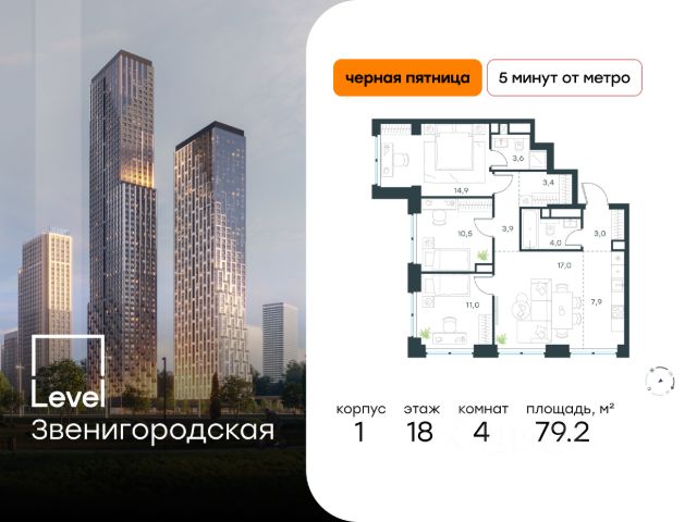 В престижном районе Хорошёво-Мнёвники продаётся 4-комнатная квартира площадью 87.30 кв.м white box. Квартира расположена на 6 этаже 48 этажного корпуса Корпус 1 в жилом комплексе класса комфорт+ Level Звенигородская (компания Level Group/Левел групп).