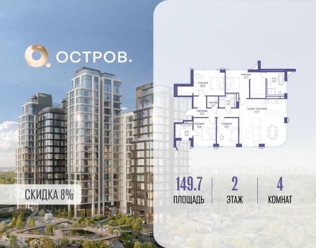 Цена указана с учётом скидки при 100%-й оплате, несубсидированной ипотеке, рассрочке (кроме программы "Рассрочка 0%"). В жилом квартале продаётся 4-комнатная квартира площадью 89.90 кв.м white box. Квартира расположена на 12 этаже 48 этажного корпуса 1 в жилом комплексе комфорт класса Левел Звенигородская (компания Level Group/Левел групп). Отличная транспортная доступность - 5 мин. пешком до метро "Звенигородская" (откроется к окончанию строительства); - 18 мин. пешком до станции МЦК "Хорошёво" и станции БКЛ "Народное ополчение"; - 4 мин. на авто до ТТК; - 8 мин. на авто до Садового кольца; - 15 мин. на авто до Кремля. Продуманный архитектурный проект - Концепция от студии Станислава Михаловского, в основу которой легло единение природы и города; - Двухкамерные стеклопакеты в окнах, алюминиевый и ПВХ профиль - в квартирах тепло зимой и прохладно летом; - С верхних этажей откроются панорамные виды на город, Москву-реку, "Москва-Сити" и Москворецкий парк; - Лобби со всеми удобствами: окна в пол, высокие потолки до 4,7 м, лаунж-зоны, колясочные, гостевые санузлы и мойки для лап животных; - Централизованные водонагреватели гарантируют круглогодичную подачу горячей воды в каждую квартиру. Благоустройство Концепция благоустройства разработана совместно с бюро UNK landscape. Высота башен приближается к 200 метрам - они словно касаются неба. Небесный простор проецируется на территорию двора с помощью подсветки, визуально увеличивая пространство и отражаясь в авторских элементах архитектуры. На территории площадью 0,45 га расположатся: - "Облако событий" - место встреч и общения; - "Облако спорта" - всё для поддержания себя в форме; - "Облако принятия решений" - пространство для работы на свежем воздухе; - "Облако спокойствия" - для отдыха в тишине природы; - "Облако игр" - площадки для подростков и самых маленьких. Инфраструктура В жилом комплексе откроется 21 коммерческое помещение: продуктовые лавки, кафе, салоны красоты, службы доставки и творческие студии. Этап 1 включает строительство двухуровневого подземного паркинга. Всего здесь расположится 351 машино-место, включая семейные места, и 264 кладовых помещения. В распоряжении жителей развитая инфраструктура района: 15 супермаркетов, 5 спортивных объектов, 9 медучреждений, 7 детских садов, 4 школы, 3 благоустроенных парка - всё в шаговой доступности. Инженерия Комфортное перемещение внутри домов будут обеспечивать надёжные лифты с доступом в паркинг с жилых этажей. В каждом корпусе предусмотрено до шести кабин, включая сервисные лифты. Попасть на территорию комплекса можно только по единому ключу доступа. Видеонаблюдение установлено на входах в подъезды, в лобби, в общих зонах, на въезде в паркинг. Гости смогут связаться с жителями дома через входные видеопанели, а управлять доступом на территорию можно через видеодомофон или приложение на телефоне. Купить 4-комнатную квартиру в новостройке с отделкой в районе Хорошево-Мневники в Москве.