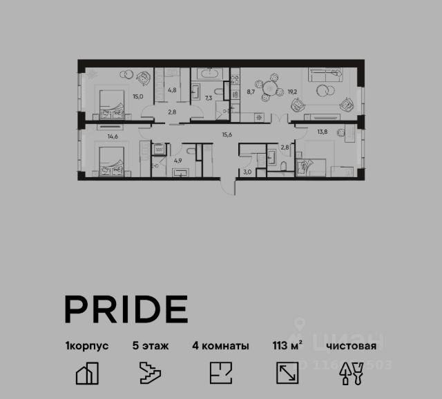 В премиальном жилом квартале PRIDE продается 4-комнатная квартира в 1 корпусе, на 5 этаже, в секции 9. Её общая площадь составляет 113 м². Пространство включает 3 уютные спальни 13,8 м², 14,6 м², 15 м², просторную кухню-гостиную 27,9 м² и 2 ванные комнаты 7,3 м² и 4,9 м². В квартире будет выполнена дизайнерская отделка, представленная двумя стилистическими решениями на выбор. Ключи в 2026 году. Удобная локация: Жилой квартал расположен в 15 минутах от Цветного бульвара в историческом районе Марьина Роща. До любой точки города быстро и удобно добраться, как на общественном транспорте, так и на авто — комплекс находится всего в 3 минутах от ТТК и в пешей доступности от метро. Яркая архитектура с переменной высотностью от 7 до 22 этажей от именитого бюро APEX формирует запоминающийся облик проекта. Развитая инфраструктура: Территория квартала делится на несколько отдельных частей: открытый просторный бульвар 3500 м² для прогулок и два внутренних камерных двора. Внутри предусмотрены площадки для спорта, места для игр и тихие пространства для отдыха и неторопливого общения. Коммерческие и торговые помещения спроектированы на уровне первых этажей: супермаркеты, магазины, рестораны и кофейни, барбершоп, спа-салон и другие сервисные точки. Образовательный центр со школой на 257 учеников и детским садом на 112 мест на собственной территории квартал - идеальное решение для семей с детьми. Таким образом, внутренняя инфраструктура PRIDE обеспечит все базовые потребности будущих жителей. Благоустроенная территория: Ландшафтный дизайн с многоуровневым и замысловатым озеленением будет радовать жителей на протяжении всех сезонов — богатая флора дворов включает в себя несколько десятков видов растений. Лобби как в лучших отелях мира: На первых этажах резидентов и гостей встретят лобби с авторским дизайном от Sundukovy Sisters, бюро знаменито своими работами для отелей и ресторанов премиум-класса во всем мире. Надежный застройщик: Девелопер PIONEER — компания с 24-летней историей. В портфеле — 40 проектов жилой, коммерческой, социальной и многофункциональной недвижимости в Москве и Санкт-Петербурге. С 2001 года было реализовано 2,9 млн м². В настоящее время 1,6 млн м² находятся в стадии проектирования и строительства. Среди новых знаковых проектов девелопера — премиальные жилые кварталы и деловые объекты класса A.