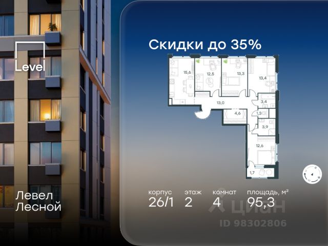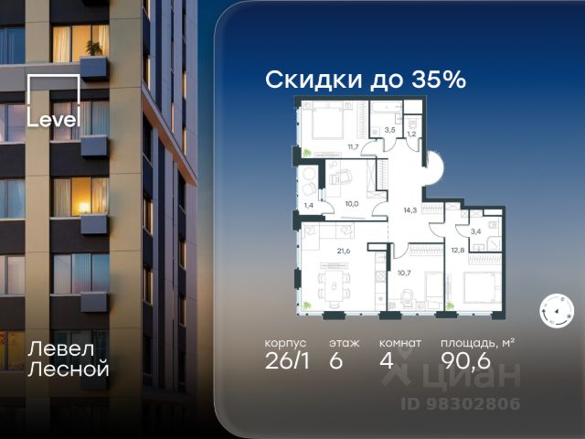 Цена указана с учётом скидки при 100%-й оплате, несубсидированной ипотеке, рассрочке (кроме программы "Рассрочка 0%"). В районе, утопающем в густой зелени лесов, многочисленных парков и скверов, продаётся 4-комнатная квартира площадью 97.80 кв.м с отделкой white box. Квартира расположена на 6 этаже в жилом комплексе комфорт-класса Левел Лесной (компания Level Group/Левел групп). Отличная транспортная доступность: - 25 мин. пешком до станции метро "Пятницкое шоссе"; - 28 мин. на автобусе до станции метро и МЦД-2 "Волоколамская"; - 11 мин. на авто до МКАД; - 25 мин. на авто до ТТК. Продуманный архитектурный проект: - Концепция проекта Левел Лесной от бюро СПИЧ; - Высотность комплекса до 15 этажей с уникальными видами на лесные массивы и город; - Высота потолков до 3 м; - Современные окна высотой до 1,6 м, в части квартир предусмотрены окна в пол. Высота подоконников 0,6 м; Расположение: Жилой комплекс Левел Лесной строится в зелёной зоне ближайшего Подмосковья, г.о. Красногорск в посёлке Отрадное. Шаговая и автомобильная доступность до метро и больших транспортных артерий города. За 25 минут вы дойдёте до станции метро "Пятницкое шоссе", а за 20 минут на машине сможете доехать до станции метро "Тушинская". Район окружен роскошной зеленью лесов и парковых зон, занимающих территорию свыше 1 000 гектаров. Помимо благоприятной экологии, здесь множество возможностей для активного отдыха и поддержания физической формы. Облагороженная территории с полностью развитой инфраструктурой. На территории проекта находится детский сад и школа "Светлые Горы", которая входит в список лучших частных школ от Forbes Education (по данным на 2023г.). Кроме того, в пешей доступности расположено ещё 8 детских садов, а также запланировано открытие современной муниципальной школы. В непосредственной близости находятся сетевые супермаркеты и локальные магазины, аптеки, клиники, почта, библиотека, салоны красоты, рестораны, спортивные и творческие секции, развивающие детские центры. В 12 минутах пешком расположен торговый парк "Отрада" с продуктовым и строительным гипермаркетами, магазинами, кинотеатром и развлечениями для детей. Внутренняя инфраструктура: Мы знаем, как важно, чтобы магазины и сервисы были всегда рядом. В сданных корпусах жилого комплекса Левел Лесной уже расположена полностью готовая развитая инфраструктура. На первых этажах корпуса 27 предусмотрено ещё 14 коммерческих помещений. Благоустройство: Продуманное пространство и аура приватного европейского городка рождают чувство лёгкости и расслабления у каждого, кто попадает на территорию проекта. Концепцию общественных площадок разработали в партнёрстве два архитектурных бюро: "Хайлайт Архитектура" (Highlight Architecture) и "Скейп" (Scape). В безопасных дворах без машин каждый обязательно найдёт себе место для вдохновения, отдыха и спорта.