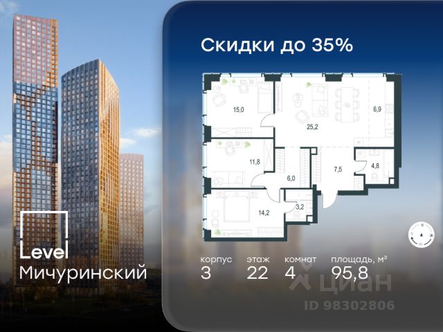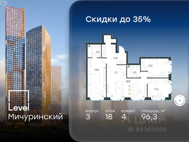 О квартире Продаётся 4-комнатная квартира общей площадью 124.7 кв.м. с отделкой white box. Квартира расположена на 13 этаже корпуса 5.1 в жилом комплексе бизнес-класса "Среда на Лобачевского" в пешей доступности от метро "Аминьевская". О жилом комплексе "Среда на Лобачевского" полностью соответствует критериям современного жилого пространства. Взяв за основу рациональный подход, мы гармонично соединили дизайн, актуальные тренды и функциональность. Продуманный современный экстерьер и функциональные планировки внутри, приватные пространства и разнообразные досуговые зоны для каждого члена семьи — все это "Среда на Лобачевского". Инфраструктура Район отлично развит и наполнен жизнью, здесь уже есть вся необходимая инфраструктура — детские сады, школы, медучреждения, торговые центры, благоустроены парки для прогулок и отдыха, удобен и легкодоступен городской транспорт. Рядом расположены учебные корпуса крупных университетов — МГУ, МГИМО и РАНХиГС. Школы и детские сады в районе занимают высокие позиции в городских рейтингах, поэтому вам не придется беспокоиться о качестве образования детей. Как и об отдыхе: поблизости расположены живописные пруды, реки и парки. Это Парк Олимпийской деревни, Парк имени 50-летия Октября, Мещерский парк и Очаковские пруды. Теперь поставить галочки в еженедельном чек-листе "спорт-прогулки-встречи с друзьями" можно, не покидая любимый район. Особенности Особое внимание в проекте уделяется созданию функциональных пространств не только внутри дома, но и за его пределами. В ландшафтном парке "Среды на Лобачевского" расположены крытые зоны для спокойного времяпровождения, места для активного отдыха и спорта, коворкинг, соседский комьюнити-центр, водные объекты. —Ландшафтный парк во дворе. —Водный сад с зонами отдыха. —Зоны коворкинга. —Дизайнерские гранд-лобби. —Бесключевой доступ. —Подземный паркинг.