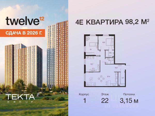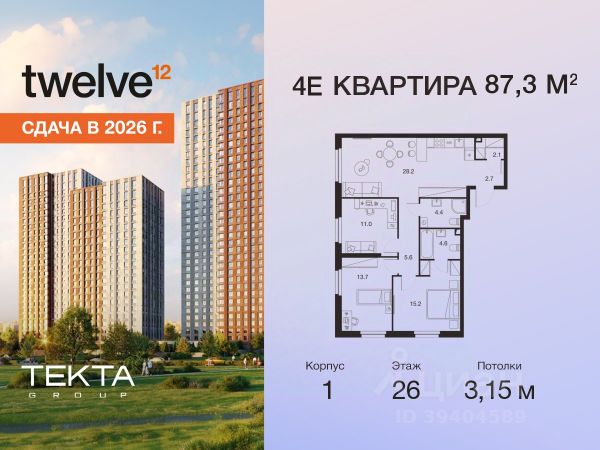 Рассрочка 0% с платежом от 120 000 ₽ в месяц. Сдача уже в 2026 году 4-комн. квартира в ЖК "Твелв" на 26 этаже в 34 этажном здании Корпус 1. Общая площадь: 87.3 кв.м., жилая: 60.70 кв.м. Высота потолков 3.15 м. ЖК Твелв от застройщика Текта Групп — это новый уровень жизни в районе Нагорный в 3-х минутах от станции метро. Проект представляет собой воплощение современной концепции комфортной жизни, где функциональность органично сочетается с эстетикой. Архитектура Твелв создает атмосферу, вдохновляющую на успех и располагающую к позитивным эмоциям. Дом, в котором каждый день будет наполнен уютом, а не рутинной работой и дорожными пробками. Твелв предлагает своим жильцам продуманные планировки, возможность объединения квартир, а также увидеть красоту города через угловое остекление увеличенных окон. Особое внимание уделено комфорту жителей: благоустроенная территория, зеленые насаждения, детские площадки, парковка. ЖК Твелв — это больше, чем просто жилье: это атмосфера умиротворенности, комфорта и гармонии.