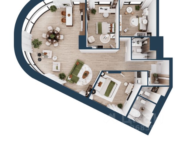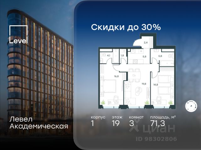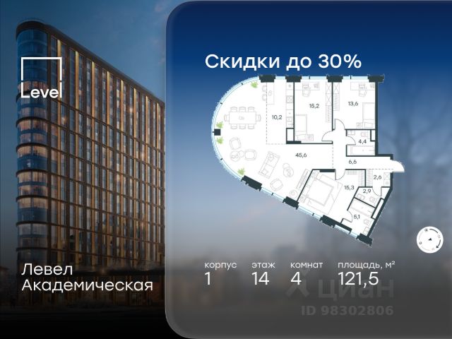 Цена указана с учётом скидки при 100%-й оплате, несубсидированной ипотеке, рассрочке (кроме программы "Рассрочка 0%"). В Академическом районе продаётся 4-комнатная квартира площадью 171.40 кв.м без отделки. Квартира расположена на 17-м этаже 19-этажного жилого комплекса бизнес-класса Левел Академическая (компания Level Group). Площади помещений определены кадастровым инженером по результатам обмеров. Отличная транспортная доступность: - 1 мин. пешком до станции метро "Академическая"; - 4 мин. на автомобиле до ТТК; - 8 мин. на автомобиле до Садового кольца; - 13 мин. на автомобиле до Кремля. Продуманный архитектурный проект: - современная архитектура от бюро UNK project; - высокие потолки в квартирах до 6,62 м; - окна в пол высотой 2,5-2,68 м с панорамным видом на МГУ, Москва-Сити и другие доминанты Москвы; - квартиры с моллированным остеклением - радиусные окна открывают увеличенный угол обзора; - более 20 вариантов планировочных решений; - уникальные квартиры с собственным патио и возможностью обустройства дровяного камина; - квартиры сдаются без отделки, что открывает свободу для создания интерьера по своему вкусу. Расположение: Камерный проект из 1 корпуса расположен тихом зеленом районе Москвы, в непосредственной близости к центру города. В округе построено 80 детских садов, 50 школ и 30 вузов, 7 из которых входят в топ100 вузов России: МГУ, МГИМО, РАНХиГС, МИСИС, РУДН, РЭУ им. Плеханова и РГУ нефти и газа им. Губкина. Этот район буквально утопает в зелени парков, начиная с уютного Академического в 6 минутах пешком и заканчивая одним из крупнейших в городе парком 50-летия Октября (12 минут на автомобиле). Общая площадь природных объектов в радиусе 2-6 км от дома - 476,5 га. Внутренняя инфраструктура: На территории жилого комплекса Левел Академическая откроется собственный торговый центр, а для отдыха жителей будут созданы общественные пространства: комфортное лобби с дизайнерской отделкой, окнами в пол и потолками высотой 4,5 м, а также две благоустроенные зоны - территория по периметру здания и пространство на стилобате. Во дворе на стилобате предусмотрены детская и спортивная площадки, коворкинг и лаунж-зона на открытом воздухе. Стилобат украсят скульптуры животных - жирафа, зайца и волка, которые станут ярким акцентом внутреннего двора жилого комплекса Левел Академическая, подчеркивая близость к музею Дарвина. Процент озеленения территории - 58%. Технологии и безопасность: Жителей жилого комплекса Левел Академическая не коснется ежегодное отключение горячей воды благодаря собственным центральным водонагревателям. Безопасность гарантирует круглосуточная охрана, безлимитный Wi-Fi, круглосуточное видеонаблюдение. Удобное перемещение внутри комплекса будут обеспечивать 5 лифтов с доступом в паркинг с жилых этажей.