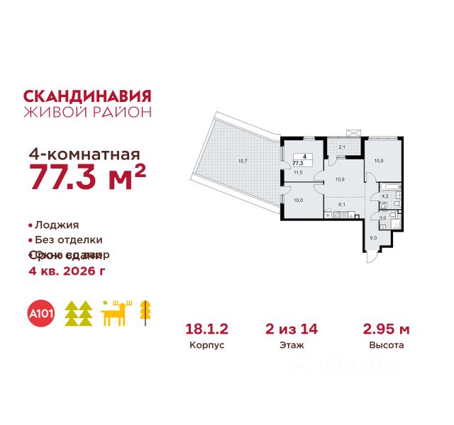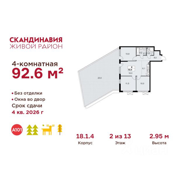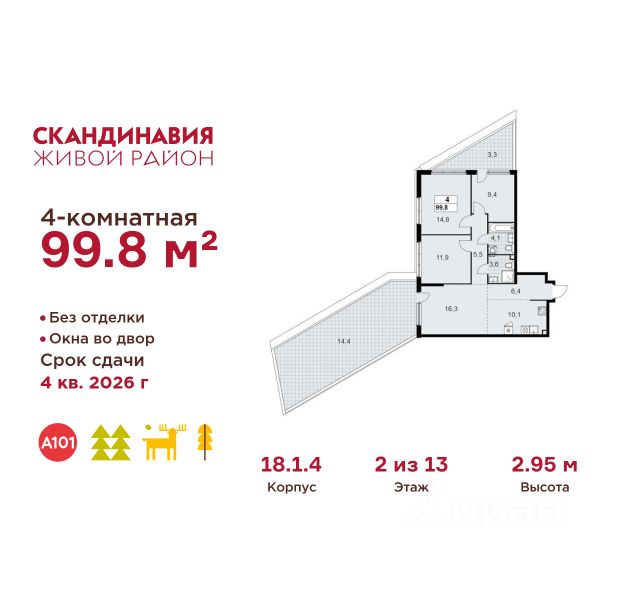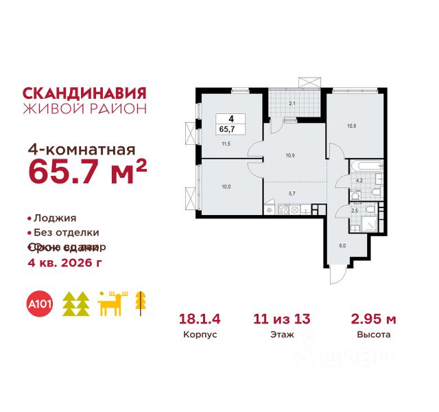 Продается четырехкомнатная квартира 311 в новостройке Жилой район "Скандинавия" по адресу Москва, ТиНАО, Новомосковский АО, Сосенское С/П, Коммунарка пос., жилой комплекс Скандинавия, 18.2.3, район Коммунарка, Новомосковский административный округ, Москва. Общая площадь квартиры - 66.20 кв. м., этаж 5 из 18, секция 5. Тип проекта, по которому построен дом - монолит, компания-застройщик - ООО "А101". Стоимость квартиры - 27569652 Р. Срок сдачи - 1 квартал 2027. ПРЕДЛОЖЕНИЯ ОТ ЗАСТРОЙЩИКА В ФЕВРАЛЕ 2026: Скидки до 10% на все квартиры. Только в офисах продаж до 28 февраля. Ипотека от 13,9 % для всех! На весь срок. "Семейная ипотека" вернулась. Ставка от 3,5 % на весь срок! Без удорожания! Выгодное ипотечное комбо: Ипотека от 2200 р./мес. и от 6 % после рождения ребёнка! Ипотека для всех "Держи пять!" - ставка 5 % на 2 года! *более подробную информацию по скидкам и акциям уточняйте в отделе продаж ЖК "Скандинавия" на границе Бутовского лесопарка (1610 га) - это баланс качественного жилья и сервисов, зелёных пространств для активного и созерцательного отдыха. Выразительная архитектура и цветовая гамма монолитных корпусов комфорт- и бизнес-класса (8-17 этажей) созвучны скандинавским мотивам, органично интегрированы в великолепный природный контекст. Огороженные дворы свободны от машин, в них продуманы места для отдыха и работы на свежем воздухе, озеленение, детские и спортивные площадки. Для прогулок, встреч и районных праздников - площадь Туве Янссон с "сухим" фонтаном, вековыми дубами и единственным в мире памятником писательнице; пешеходный променад 2 км; 3 крупных природных ручья; более 15 км велосипедных и прогулочных дорожек с арт-объектами. Инфраструктура района включает современные школы и детские сады, центр впечатлений, фитнес-клубы, развивающие и творческие центры, магазины, кафе, салоны красоты. На подземных этажах - паркинги и кладовые. Преимущества "Скандинавии": - ст. метро "Потапово" - 100 м от ближайших домов (открыта!) - удобные выезды на трассу Солнцево - Бутово - Варшавское шоссе и ул. Бачуринская - свои школы и детские сады - инфраструктура на первых этажах и рядом с домом - лесопарк, природные водоёмы, прогулочные маршруты