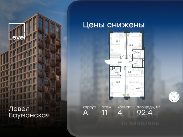 Цена указана с учётом скидки при 100%-й оплате, несубсидированной ипотеке, рассрочке (кроме программы "Рассрочка 0%"). В Басманном районе (ЦАО) продается 4-комнатная квартира площадью 121.50 кв.м без отделки. Квартира расположена на 1 этаже 17-этажного корпуса " B" в жилом комплексе бизнес-класса Левел Бауманская (компания Level Group). Отличная транспортная доступность: - 15 мин. пешком до метро "Бауманская" и "Электрозаводская"; - 4 мин. на авто до ТТК; - 8 мин. на авто до Садового кольца; - 15 мин. на авто до Кремля. Продуманный архитектурный проект: - Архитектура от бюро ARCH(E)TYPE, вдохновленная историей района; - 95% квартир с панорамными видами на набережные, парки и сталинские высотки; - Высокие потолки от 3,02 м до 6,3 м; - Лобби с комфортными лаунж-зонами; - Благоустроенный закрытый двор без машин. Расположение и инфраструктура: Жилой комплекс Левел Бауманская расположен в престижном Басманном районе (ЦАО). В пешей доступности находится легендарный МГТУ им. Баумана, Британский и Ломоносовский лицеи, а за 10 минут на автомобиле можно доехать до НИУ ВШЭ и других престижных вузов. На территории проекта предусмотрена развитая внутренняя инфраструктура: собственный детский сад и 10 коммерческих помещений на первых этажах домов. Благоустройство: Концепция благоустройства создана в соавторстве с именитым бюро GAFA. На площади 0,35 га расположатся зоны для отдыха, занятий спортом и прогулок. Во дворе для жителей жилого комплекса будет создан коворкинг прямо на свежем воздухе - открытые беседки и вайфай на территории. Атмосферу приватности подчеркнёт обилие растительности - деревья и кустарники займут 50% двора. За счёт большого количества хвойных насаждений территория жилого комплекса будет зелёной круглый год. Инженерия и комфорт: Жители жилого комплекса Левел Бауманская не зависят от сезонного отключения горячей воды. Для этого в проекте предусмотрены центральные водонагреватели, обеспечивающие комфорт круглый год. Для безопасности созданы следующие системы контроля доступа: круглосуточное видеонаблюдение всех общественных зон (лобби, двор, лифты, паркинг), вызывные панели у входов на закрытую территорию, видеодомофоны с возможностью управления через мобильное приложение, распознавание автомобильных номеров при въезде/выезде в/из паркинга. По заявке собственнику предоставляется возможность просмотра изображения отдельных видеокамер. Лифты: В жилом комплексе устанавливается лифтовое оборудование SRH - одного из ведущих производителей с 20-летним опытом и 40 представительствами по всему миру. Кабины от SRH отличаются тихим и плавным ходом, особой износостойкостью и современными технологическими и дизайнерскими решениями. Все лифты имеют прямой доступ в паркинг с жилых этажей. В домах также предусмотрен сервисный лифт. Грузоподъёмность лифтов от 450 до 1000 кг, скорость 1,6 м/с.