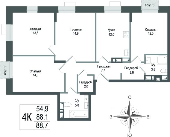 Продаётся 4-комнатная квартира в строящемся доме (Корпус 2), срок сдачи: II-кв. 2027, общей площадью 88.1 кв.м., на 3 этаже. ЖК "Киноквартал" , МО, г. Королев, мкр. Первомайский, ул. Солнечная, д. 2