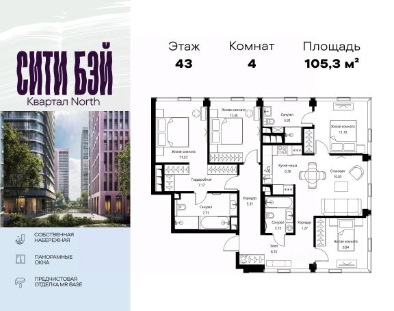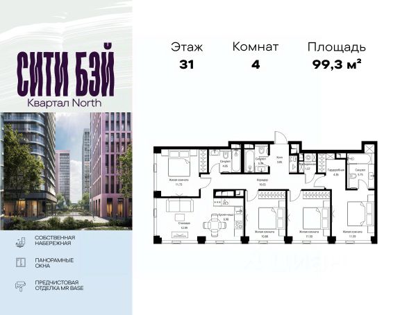 Прямая продажа от застройщика. Продаётся 4-комнатная квартира общей площадью 104.60 м² без отделки в ЖК Сити Бэй, квартале Пасифик, на 6-м этаже 59 этажного дома. Концепция жилого комплекса Сити Бэй - настоящий город в городе с отлично развитой инфраструктурой и собственной благоустроенной набережной. На территории жилого комплекса расположено пять кварталов - Атлантик, Пасифик, Индиан, Норс, Cliff. Жилой квартал Сити Бэй отличается оригинальной концепцией и выделяется среди других проектов такими характеристиками как: - Архитектура, - Виды из окон, - Природное окружение, вызывая гордость у жителей и восхищение у прохожих. Вся жизнь района Покровское-Стрешнево строится вокруг водных объектов: - Пойма реки Сходни с уникальной экосистемой, - Речка Химка и Химкинское водохранилище, - Москва-река, - Канал имени Москвы. Кругом вода, и местные с удовольствием этим пользуются. А сразу за рекой - центр водного спорта в Строгино с вейк-парком и яхт-клубами. Помимо воды, здесь очень много зелени: - Рядом Сходненский ковш памятник природы, естественный амфитеатр глубиной 40 метров; - Парк при усадьбе Братцево с фруктовым садом; - Дубовая роща "Маяк", - Алешкинский лес; - Лесопарк Покровское-Стрешнево с пляжами и бобрами. Главные транспортные артерии района: - Волоколамское шоссе, - Таганско-Краснопресненская линия метро и МЦД-2. Всего за 20 минут можно добраться до центра на машине или метро, а МЦД связывает ЖК Сити Бэй с северными, восточными и юго-восточными районами. Компания MR предлагает своим клиентам специальные условия приобретения квартир в рамках программ ипотечного кредитования от банков-партнеров.