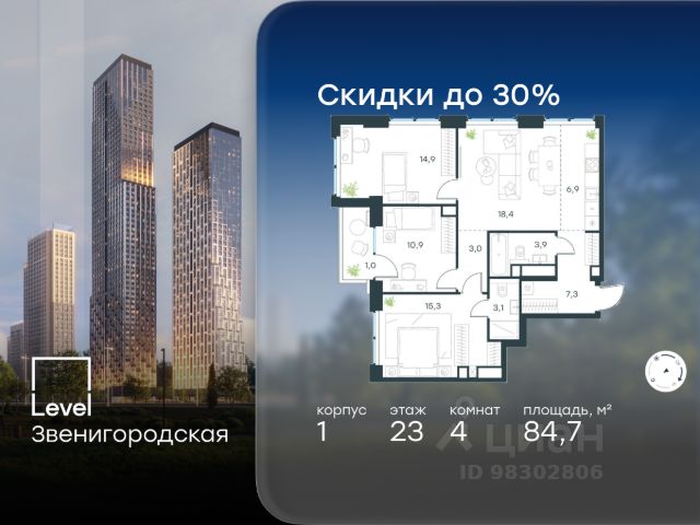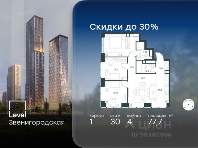 Цена указана с учётом скидки при 100%-й оплате, несубсидированной ипотеке, рассрочке (кроме программы "Рассрочка 0%"). В жилом квартале продаётся 4-комнатная квартира площадью 87.30 кв.м white box. Квартира расположена на 6 этаже 48 этажного корпуса 1 в жилом комплексе комфорт класса Level Звенигородская (компания Level Group/Левел групп). Отличная транспортная доступность - 5 мин. пешком до метро "Звенигородская" (откроется к окончанию строительства); - 18 мин. пешком до станции МЦК "Хорошёво" и станции БКЛ "Народное ополчение"; - 4 мин. на авто до ТТК; - 8 мин. на авто до Садового кольца; - 15 мин. на авто до Кремля. Продуманный архитектурный проект - Концепция от студии Станислава Михаловского, в основу которой легло единение природы и города; - Двухкамерные стеклопакеты в окнах, алюминиевый и ПВХ профиль - в квартирах тепло зимой и прохладно летом; - С верхних этажей откроются панорамные виды на город, Москву-реку, "Москва-Сити" и Москворецкий парк; - Лобби со всеми удобствами: окна в пол, высокие потолки до 4,7 м, лаунж-зоны, колясочные, гостевые санузлы и мойки для лап животных; - Централизованные водонагреватели гарантируют круглогодичную подачу горячей воды в каждую квартиру. Благоустройство Концепция благоустройства разработана совместно с бюро UNK landscape. Высота башен приближается к 200 метрам - они словно касаются неба. Небесный простор проецируется на территорию двора с помощью подсветки, визуально увеличивая пространство и отражаясь в авторских элементах архитектуры. На территории площадью 0,45 га расположатся: - "Облако событий" - место встреч и общения; - "Облако спорта" - всё для поддержания себя в форме; - "Облако принятия решений" - пространство для работы на свежем воздухе; - "Облако спокойствия" - для отдыха в тишине природы; - "Облако игр" - площадки для подростков и самых маленьких. Инфраструктура В жилом комплексе откроется 21 коммерческое помещение: продуктовые лавки, кафе, салоны красоты, службы доставки и творческие студии. Этап 1 включает строительство двухуровневого подземного паркинга. Всего здесь расположится 351 машино-место, включая семейные места, и 264 кладовых помещения. В распоряжении жителей развитая инфраструктура района: 15 супермаркетов, 5 спортивных объектов, 9 медучреждений, 7 детских садов, 4 школы, 3 благоустроенных парка - всё в шаговой доступности. Инженерия Комфортное перемещение внутри домов будут обеспечивать надёжные лифты с доступом в паркинг с жилых этажей. В каждом корпусе предусмотрено до шести кабин, включая сервисные лифты. Попасть на территорию комплекса можно только по единому ключу доступа. Видеонаблюдение установлено на входах в подъезды, в лобби, в общих зонах, на въезде в паркинг. Гости смогут связаться с жителями дома через входные видеопанели, а управлять доступом на территорию можно через видеодомофон или приложение на телефоне. 4-комнатная квартира от застройщика станция Хорошево (МЦК).