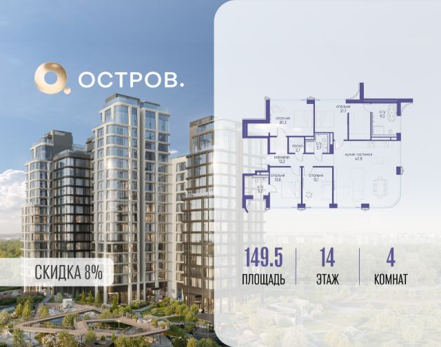 Цена указана с учётом скидки при 100%-й оплате, несубсидированной ипотеке, рассрочке (кроме программы "Рассрочка 0%"). В жилом квартале продаётся 4-комнатная квартира площадью 84.70 кв.м white box. Квартира расположена на 23 этаже 48 этажного корпуса 1 в жилом комплексе комфорт класса Левел Звенигородская (компания Level Group/Левел групп). Отличная транспортная доступность - 5 мин. пешком до метро "Звенигородская" (откроется к окончанию строительства); - 18 мин. пешком до станции МЦК "Хорошёво" и станции БКЛ "Народное ополчение"; - 4 мин. на авто до ТТК; - 8 мин. на авто до Садового кольца; - 15 мин. на авто до Кремля. Продуманный архитектурный проект - Концепция от студии Станислава Михаловского, в основу которой легло единение природы и города; - Двухкамерные стеклопакеты в окнах, алюминиевый и ПВХ профиль - в квартирах тепло зимой и прохладно летом; - С верхних этажей откроются панорамные виды на город, Москву-реку, "Москва-Сити" и Москворецкий парк; - Лобби со всеми удобствами: окна в пол, высокие потолки до 4,7 м, лаунж-зоны, колясочные, гостевые санузлы и мойки для лап животных; - Централизованные водонагреватели гарантируют круглогодичную подачу горячей воды в каждую квартиру. Благоустройство Концепция благоустройства разработана совместно с бюро UNK landscape. Высота башен приближается к 200 метрам - они словно касаются неба. Небесный простор проецируется на территорию двора с помощью подсветки, визуально увеличивая пространство и отражаясь в авторских элементах архитектуры. На территории площадью 0,45 га расположатся: - "Облако событий" - место встреч и общения; - "Облако спорта" - всё для поддержания себя в форме; - "Облако принятия решений" - пространство для работы на свежем воздухе; - "Облако спокойствия" - для отдыха в тишине природы; - "Облако игр" - площадки для подростков и самых маленьких. Инфраструктура В жилом комплексе откроется 21 коммерческое помещение: продуктовые лавки, кафе, салоны красоты, службы доставки и творческие студии. Этап 1 включает строительство двухуровневого подземного паркинга. Всего здесь расположится 351 машино-место, включая семейные места, и 264 кладовых помещения. В распоряжении жителей развитая инфраструктура района: 15 супермаркетов, 5 спортивных объектов, 9 медучреждений, 7 детских садов, 4 школы, 3 благоустроенных парка - всё в шаговой доступности. Инженерия Комфортное перемещение внутри домов будут обеспечивать надёжные лифты с доступом в паркинг с жилых этажей. В каждом корпусе предусмотрено до шести кабин, включая сервисные лифты. Попасть на территорию комплекса можно только по единому ключу доступа. Видеонаблюдение установлено на входах в подъезды, в лобби, в общих зонах, на въезде в паркинг. Гости смогут связаться с жителями дома через входные видеопанели, а управлять доступом на территорию можно через видеодомофон или приложение на телефоне.