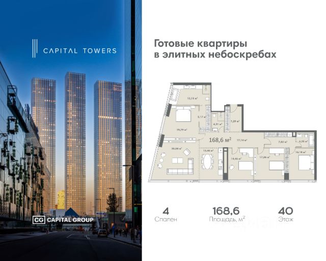 Capital Towers — это три современных жилых небоскрёба у Москва-Сити на берегу реки. Высота каждой башни — почти 300 метров, из окон открываются панорамные виды на центр Москвы, Москва-Сити, Лужники, МГУ и парк "Красная Пресня" Уникальная двухсторонняя 4-х комнатная квартира для дружной семьи площадью 120,9 кв. м, расположенная на 56 этаже в башне City. Удачное планировочное решение позволяет организовать комфортное пространство из 3-х видовых спален и просторной угловой кухни-гостиной площадью 46 кв. м. Изолированная зона мастер-бедрум с собственной ванной комнатой. Из окон квартиры открываются завораживающие виды в сторону ул. 1905 года, парк Красная Пресня, Дом Правительства РФ, гостиницу Украина и Москва-реку. Квартира предлагается к продаже с отделкой white box от застройщика. Комплекс создан для комфортной и спокойной жизни: закрытая территория, охрана, подземный паркинг с зарядками для электромобилей, фитнес, SPA, кафе, магазины, детские зоны. Capital Towers — это сочетание комфорта, современного стиля и захватывающих видов на Москву