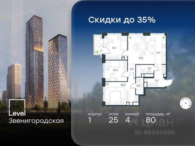 Цена указана с учётом скидки при 100%-й оплате, несубсидированной ипотеке, рассрочке (кроме программы "Рассрочка 0%"). В жилом квартале продаётся 4-комнатная квартира площадью 87.30 кв.м white box. Квартира расположена на 6 этаже 48 этажного корпуса 1 в жилом комплексе комфорт класса Level Звенигородская (компания Level Group/Левел групп). Отличная транспортная доступность - 5 мин. пешком до метро "Звенигородская" (откроется к окончанию строительства); - 18 мин. пешком до станции МЦК "Хорошёво" и станции БКЛ "Народное ополчение"; - 4 мин. на авто до ТТК; - 8 мин. на авто до Садового кольца; - 15 мин. на авто до Кремля. Продуманный архитектурный проект - Концепция от студии Станислава Михаловского, в основу которой легло единение природы и города; - Двухкамерные стеклопакеты в окнах, алюминиевый и ПВХ профиль - в квартирах тепло зимой и прохладно летом; - С верхних этажей откроются панорамные виды на город, Москву-реку, "Москва-Сити" и Москворецкий парк; - Лобби со всеми удобствами: окна в пол, высокие потолки до 4,7 м, лаунж-зоны, колясочные, гостевые санузлы и мойки для лап животных; - Централизованные водонагреватели гарантируют круглогодичную подачу горячей воды в каждую квартиру. Благоустройство Концепция благоустройства разработана совместно с бюро UNK landscape. Высота башен приближается к 200 метрам - они словно касаются неба. Небесный простор проецируется на территорию двора с помощью подсветки, визуально увеличивая пространство и отражаясь в авторских элементах архитектуры. На территории площадью 0,45 га расположатся: - "Облако событий" - место встреч и общения; - "Облако спорта" - всё для поддержания себя в форме; - "Облако принятия решений" - пространство для работы на свежем воздухе; - "Облако спокойствия" - для отдыха в тишине природы; - "Облако игр" - площадки для подростков и самых маленьких. Инфраструктура В жилом комплексе откроется 21 коммерческое помещение: продуктовые лавки, кафе, салоны красоты, службы доставки и творческие студии. Этап 1 включает строительство двухуровневого подземного паркинга. Всего здесь расположится 351 машино-место, включая семейные места, и 264 кладовых помещения. В распоряжении жителей развитая инфраструктура района: 15 супермаркетов, 5 спортивных объектов, 9 медучреждений, 7 детских садов, 4 школы, 3 благоустроенных парка - всё в шаговой доступности. Инженерия Комфортное перемещение внутри домов будут обеспечивать надёжные лифты с доступом в паркинг с жилых этажей. В каждом корпусе предусмотрено до шести кабин, включая сервисные лифты. Попасть на территорию комплекса можно только по единому ключу доступа. Видеонаблюдение установлено на входах в подъезды, в лобби, в общих зонах, на въезде в паркинг. Гости смогут связаться с жителями дома через входные видеопанели, а управлять доступом на территорию можно через видеодомофон или приложение на телефоне.