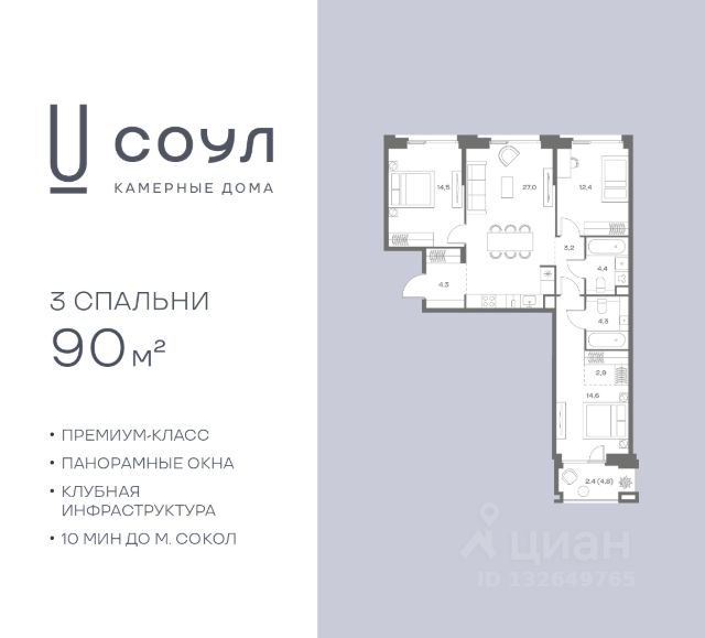 Цена указана с учётом скидки при 100%-й оплате, несубсидированной ипотеке, рассрочке (кроме программы "Рассрочка 0%"). Продается 4-комнатная квартира площадью 99.10 кв. м с отделкой. Квартира находится на 19 этаже 26-этажного корпуса 4, в новом жилом комплексе бизнес-класса Левел Войковская, расположенном рядом с живописным заповедником "Покровское-Стрешнево" (застройщик - компания Level Group/Левел групп). Прекрасная транспортная доступность - 7 мин. пешком до станции МЦК "Балтийская"; - 15 мин. пешком до станции метро "Войковская"; - 8 мин. на машине до ТТК; - 15 мин. на машине до центра Москвы; - 20 мин. на машине до Москва-Сити. Продуманный архитектурный проект - стильная архитектура от мастерской Фефелова В. В.; - панорамные виды на парки, Химкинское водохранилище и Останкинскую башню; - лобби с высотой потолков до 6,45 метров; - более 20 видов планировок, включая редкие форматы квартир с террасой и увеличенной высотой потолков до 5,42 метров; - 2 варианта дизайнерской отделки в корпусе 4 как дополнительная опция к отделке white box: стиль Modern в светлых холодных тонах и стиль Classic в нейтральной бежевой гамме. Квартиры в корпусах 3 и 5 сдаются без отделки. Расположение Жилой комплекс Левел Войковская строится в престижном Северном округе Москвы, где развитая инфраструктура и живописная природа переплетаются в единый ансамбль. Войковский район окружают парки и набережные. В шаговой доступности - парк "Покровское-Стрешнево", не более 15-ти минут на велосипеде занимает путь до Тимирязевского парка и 9-ти минут до парка усадьбы Михалково. Рядом более 60 школ, 75 дошкольных учреждений, 17 государственных и 6 частных вузов, 25 супермаркетов, 4 торговых центра, среди которых ТЦ "Метрополис" и ТЦ "Авиапарк". Внутренняя инфраструктура На территории жилого комплекса предусмотрены коммерческие помещения: кафе, ресторан, пекарня и другие сервисы на первых этажах корпусов. Для жителей будет доступен отапливаемый подземный паркинг на 244 машино-места с доступом с любого этажа на лифте. На территории паркинга будет расположено 125 кладовых помещений для хранения сезонного инвентаря. Лобби и благоустройство Дизайн лобби жилого комплекса Левел Войковская создан совместно с бюро BLANK. Теплая цветовая гамма, ресепшен, зоны ожидания, лапомойки и гостевые санузлы - каждая деталь превращает лобби в комфортное продолжение вашего дома. 1,15 га площади в первых двух этапах строительства отведено под приватный внутренний двор, который спроектирован совместно с бюро "Правда". Детские площадки для всех возрастов, спортивные пространства для йоги, воркаута и петанка, уютные зоны для тихого отдыха или работы. Здесь утро начинается с вдохновения, а вечер наполнен приятными моментами. Лифты Комфортное перемещение внутри жилого комплекса обеспечат надёжные лифты с доступом в паркинг с жилых этажей. В каждом корпусе предусмотрено по 3 грузопассажирских лифта. Купить 4-комнатную квартиру с отделкой в районе Войковский в Москве.