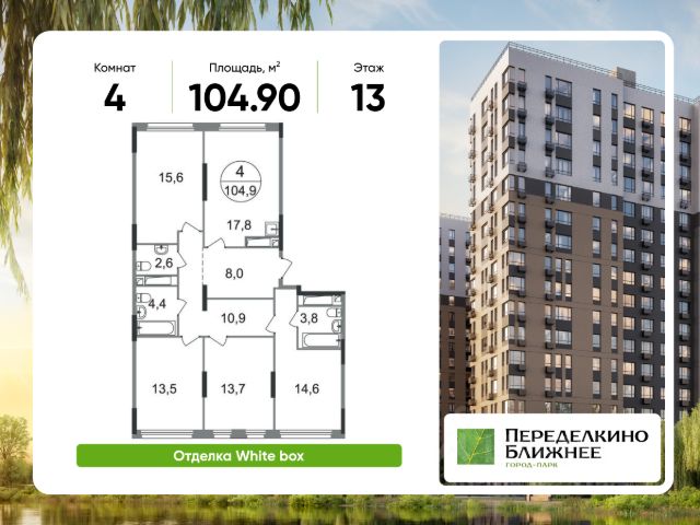 Продается четырехкомнатная квартира в городе-парке "Переделкино Ближнее". Общая площадь квартиры - 105,8 кв. м, этаж 13 из 17. Срок сдачи - 1 квартал 2028 года. Тип дома - монолитный. Корпус расположен в новой 13 фазе строительства и состоит из 8 секций с переменной этажностью 12-17 этажей. Все секции без отделки. Около 13 фазы запланировано строительство многоуровневого паркинга на 300 м/мест. 13 фаза имеет уникальное расположение и находится непосредственно на берегу Федосьинского пруда, который является сердцем города-парка "Переделкино Ближнее". Город-парк "Переделкино Ближнее" расположен в 8 км от МКАД по Боровскому шоссе. ТРАНСПОРТНАЯ ДОСТУПНОСТЬ: - 15 минут пешком до станции МЦД-4 "Мичуринец" - 25 минут пешком до станции метро "Рассказовка" Солнцевской линии - 30 минут до центра Москвы - 2026 г. - открытие трассы Солнцево-Бутово-Варшавское шоссе РАЗВИТАЯ СОЦИАЛЬНАЯ ИНФРАСТРУКТУРА: - 7 детских садов, 3 школы - банки, продуктовые магазины, аптеки, фитнес центры, салоны красоты и пр БЛАГОУСТРОЙСТВО: - дворы без машин - игровые зоны и развивающие детские площадки - зоны для созерцательного и медитативного отдыха - зоны для занятий спортом ОСОБЕННОСТИ АРХИТЕКТУРЫ: - высокие потолки от 3,03 м - безбарьерные входные группы - колясочные в каждой входной группе - кладовые помещения расположены на -1 этаже каждой секции - в каждой секции 2 лифта: 1 пассажирский, 1 грузовой - на фасаде предусмотрены корзины для установки кондиционеров АВТОРСКИЙ ДИЗАЙН: Входные группы выполнены по авторскому дизайну, благодаря панорамному остеклению наполнены естественным светом. В каждой входной группе будет располагаться комфортабельная зона ожидания с возможностью зарядить электронные устройства, почтовые ящики, колясочная, акцентные пуфы и столик. Продам 4-комнатную квартиру первичка в округе НАО (Новомосковский) в Москве.