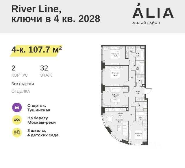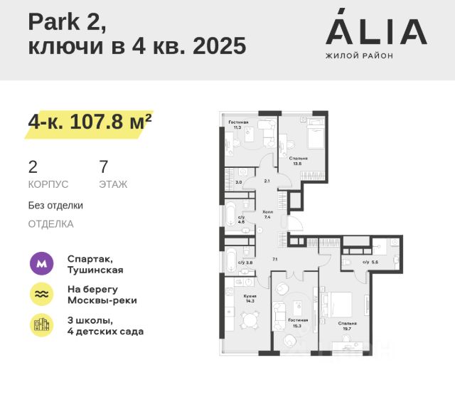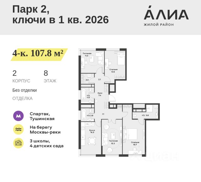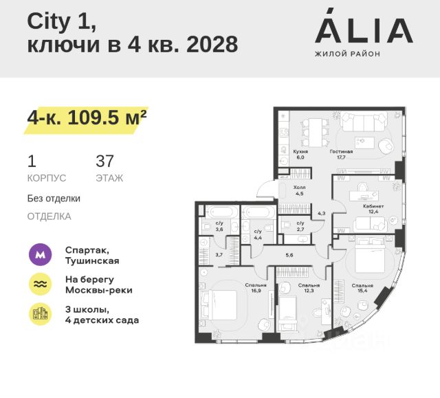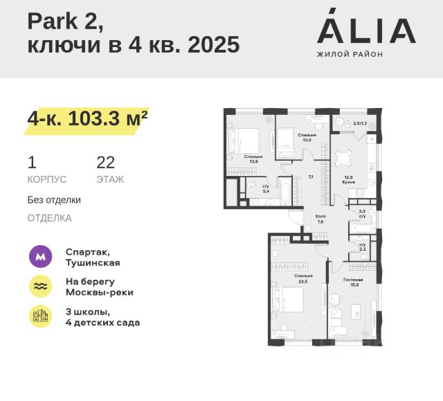 Продаётся 4-комнатная квартира 113 м². В жилом районе Алиа на 10-м этаже 11-этажного дома. Жилой район Алиа — это дома бизнес-класса у слияния Москвы-реки и Сходни. Алиа находится в Покровском-Стрешневе, экологически чистом районе на престижном северо-западе столицы. Район возводится на бывшей территории Тушинского аэрополя, где никогда не было промышленного производства. Алиа — это район разностороннего развития, спроектированный по принципу WORK.LIVE.PLAY.LEARN. Это "15-минутный город", где вся необходимая для комфортной жизни инфраструктура — на расстоянии приятной прогулки. У района удобное расположение: отсюда меньше 10 минут пешком до станций метро "Спартак" и "Тушинская" и всего полчаса на автомобиле до центра города или аэропорта Шереметьево. Архитектурную концепцию Алиа разработало бюро SOM (Skidmore, Owings & Merrill), авторы знаменитой "Бурдж-Халифа". В Алиа больше 140 планировочных решений, среди которых — редкие для Москвы форматы: квартиры с окном в ванной, пентхаус, сити-юниты и таунхаусы. Почти половина территории района отдана под благоустройство. В Алиа три парка: Линейный парк с кафе и магазинами, Центральный парк с амфитеатром, сухим фонтаном и большим плейхабом для детей всех возрастов и Прибрежный парк на собственной набережной, одной из самых длинных в Москве. В каждом урбан-блоке — закрытый внутренний двор с гипоаллергенными растениями и детской площадкой. В лобби каждого жилого корпуса в Алиа оборудована зона ожидания, колясочная, гостевой санузел и лапомойка для домашних животных. За стойкой ресепшена резидентов и их гостей встречает консьерж. Центральное лобби урбан-блока — это стильное общественное пространство с коворкингом, лаундж-зоной и кофе-пойнтом. Это "вторая гостиная" жителей урбан-блока и одно из мест, где формируется комьюнити Алиа. Два ключевых объекта инфраструктуры в Алиа — это спорткомплекс "Чкалов Арена", где представлены 25 видов спорта, и самый большой в стране бизнес-парк класса A, благодаря которому району обеспечено быстрое развитие. Купить 4-комнатную квартиру первичка в районе Покровское-Стрешнево в Москве.