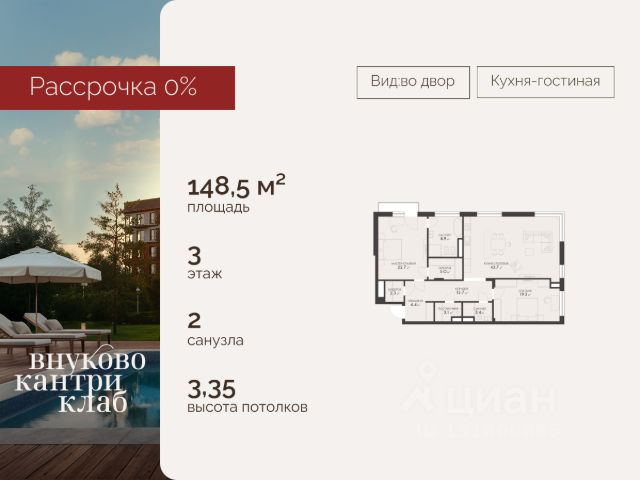 Скидка 15% на ограниченное количество квартир! Продается видовая квартира (площадь - 315.80 кв. м., комнат - 4, этаж 6) в клубном поселке премиум-класса Vnukovo Country Club. Комплекс расположен на Западе Москвы в экологически-чистом районе в окружении Ульяновского и Валуевского лесопарков. 30 Га зеленой территории с ландшафтным дизайном, пешеходными и вело-маршрутами, озером и рекой. На закрытой территории комплекса более 10 объектов собственной инфраструктуры: * Подогреваемый открытый и крытый бассейны; * Многофункциональный спортивный комплекс с более 20 видами спорта; СПА-центр; Школа, детский сад, более 40 различных кружков и секций; Досуговый центр с коворкингом, библиотекой и кинозалом Семейный ресторан VESNA с приватным клабхаусом для работы, отдыха и общения резидентов жилого комплекса * Торговая галерея с премиальным супермаркетом, пекарней, аптекой и химчисткой * Приватный парк с лаунж-зонами и др. Уникальной особенностью комплекса является вертикальное озеленение фасадов и просторные видовые террасы. Квартиры во Vnukovo Country Club предлагаются с различными вариантами отделки и без нее, а также доступна опция полной меблировки - такие квартиры полностью готовы к проживанию. Расположение: * 5 мин. до МЦД-4 "Санино"; * 15 мин. до аэропорта "Внуково"; * 20 мин. до МКАД по Киевскому шоссе; * 35 мин. до "Москва-Сити" За подробной консультацией обращайтесь по телефону.