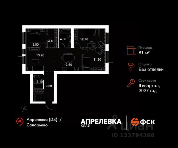 Прямая продажа от застройщика! Загородный жилой комплекс класса Комфорт Плюс. Продаётся 4-к квартира 102 общей площадью 91.8 кв.м на 5-м этаже 5 этажного дома. Без отделки. Расположение комплекса: "Апрелевка Клаб" это жилой комплекс всего в 30 км от Москвы по Киевскому шоссе, где городские удобства гармонично сочетаются с природой. Здесь начинается новая ступень жизни: современная малоэтажная застройка не нарушает живописные виды, а закрытая территория дарит чувство безопасности. Особенности проекта: - Улучшенная отделка МОПов - Социальная инфраструктура в шаговой доступности: муниципальные детский сад и школа, поликлиника - Не просто школа: школа МГИМО - Школа искусств МАРХИ - Всесезонное уникальное благоустройство: от города к природе через призму искусства - Комфортное пространство (спорт, досуг с детьми, работа в удаленном формате с прекрасными видами, место для творчества, тихие места для уединения и размышления) - Отличная транспортная доступность Транспортная доступность: - Метро Филатов Луг и Рассказовка 25 км - МЦД Апрелевка 5 км - МКАД — 30 км - Садовое кольцо — 45 км - Метро в Троицке (открытие в 2030) — 22 км - Ближайшая остановка общ. транспорта "Фрунзевец" 550 м - Ст. м. "Саларьево" 30 мин. на автобусе Внутренняя инфраструктура: Здесь есть хобби на любой вкус, возраст и сезон. Велосипедные, беговые и прогулочные маршруты, уличный workout, летний амфитеатр, спортивная площадка, центральная площадь с сухим фонтаном и игровыми зонами. Крытые развлечения: зона коворкинга, детская комната, кафе. В жилом комплексе будет современная школа на 830 мест и детский сад на 400 мест нового формата: с просторными классами и современным оснащением согласно высоким стандартам. Также на территории будет размещена школа искусств. Дворы без машин, игровые зоны и маршруты для прогулок с навигацией минимизируют риски и создают ощущение защищенности. Вдоль южной границы комплекса протекает река Десна, создавая зону отдыха в природном окружении.