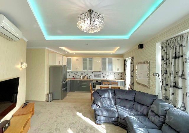 Войдя в апартаменты, мы попадаем в прихожую (4м²) в которой расположен гостевой сан. узел (1.7м²), шкаф для верхней одежды, пуфик и лестница на верхние этажи. Далее мы попадаем в кухню (10м²) с обеденной зоной. На кухне, установлен встроенный гарнитур который полностью укомплектован техникой. Варочная панель, вытяжка, посудомоечная машина, холодильник, микроволновая печь, чайник и вся необходимая посуда. Обеденная зона представляет из себя большой стол и 3 стула. Далее мы попадаем в гостиную (13м²), в которой располагается большой диван с зоной TV. Изюминкой на торте является второй свет, расположенный над зоной отдыха в гостиной, и создает впечатление будто вы находитесь не в квартире, а в загородном доме.
