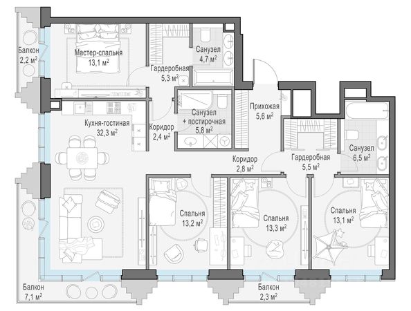 В продаже 4-комнатная квартира квартира в элитном квартале "Тишинский бульвар". Общая площадь квартиры - 127.50 кв.м. Этаж 3 из 14. Корпус К3. "Тишинский бульвар" - тихий зелёный элитный квартал на Тишинке, в престижном и комфортном районе центра Москвы. В нём создан уникальный для элитного дома прогулочный бульвар в своём огромном парке 1,9 га. В парке оборудованы зоны для активного и тихого отдыха, крытые галереи, приватные зелёные комнаты, многофункциональная спортивная площадка, воркаут-зона, детская площадка, сухой фонтан, ручей. В пешей доступности Римско-католический кафедральный собор. Всего в полутора километрах от квартала находятся Патриаршие пруды - излюбленное место для летних прогулок, воскресных бранчей и романтических ужинов. Белая площадь расположена ещё ближе - на расстоянии 1,2 километра. Это точка концентрации деловой жизни и модных ресторанов. В "Тишинский бульваре" только для жителей и их гостей создан уникальный для элитного дома прогулочный бульвар в собственном огромном парке площадью 2,1 га, который занимает 70% территории квартала. Бульвар проходит через весь квартал и объединяет в общее пространство три двора: Кленовый, Рябиновый и Ивовый. В парке созданы крытые галереи и приватные зелёные комнаты для отдыха и медитаций в любую погоду. Насыщенное озеленение многолетними растениями с разными периодами цветения сохраняет территорию квартала красивой круглый год. В квартале насыщенная инфраструктура только для жителей, включая Clubhouse. Здесь оборудованы пространства для здорового образа жизни по стандарту FIT LAB: в парке - многофункциональная спортивная площадка, воркаут-зона, место для занятий йогой и медитации; бесплатный фитнес-клуб с бассейном. Для маленьких жителей доступны детская площадка и игровая комната по стандарту KIDS LAB. Дома оснащены самыми полными и лучшими системами.