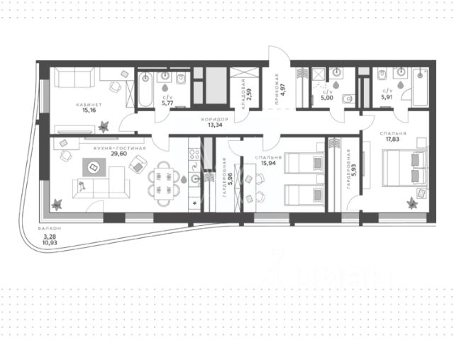 Планировкой квартиры предусмотрено: кухня с выделенной обеденной зоной, гостиная с современным камином, 4 спальные комнаты, две гардеробные, 4 санузла, включая гостевой. Отдельного внимания заслуживает просторная терраса, где оборудована зона барбекю для встречи гостей и совместного отдыха. В настоящее время в квартире идут ремонтные работы, - отличная возможность обустроить пространство в соответствии с Вашими идеями
