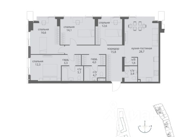 Около 10 минут до Москва Сити и ТТК! В продаже 4-к квартира от застройщика. Общая площадь 130.9, жилая 26.7, кухня 104.2. Квартира расположена на 22 этаже жилого квартала "Событие-6", корпус 2, Секция 5. Квартира без отделки. Срок сдачи: 4 кв. 2029 года. СОБЫТИЕ.6 — финальный дом парк квартала СОБЫТИЕ на Мосфильмовской, созданный для тех, кто хочет "заняться жизнью" здесь и сейчас и получать максимум от каждого дня. Стильная архитектура, продуманное благоустройство и богатый набор общественных пространств делают дом естественной сценой для ярких личных событий. Архитектура от бюро Atrium на базе дизайн кода британских LDA Design и UHA London. Лучшая новостройка страны 2025 года! Расположение: • Около 7-10 минут пешком до станций метро "Аминьевская" и "Мичуринский проспект" (в зависимости от маршрута) • Около 15 минут до Садового кольца • Около 25 минут до аэропорта Внуково • Рядом — ключевые магистрали (Кутузовский, Мичуринский, Ломоносовский проспекты, Аминьевское шоссе), что упрощает выезды как в центр, так и за город Инфраструктура "всё у дома" Главный центр притяжения — модный парк "Событие" от бюро Wowhaus. Благоустроенный бульвар и рекреационные зоны занимают около половины территории квартала, а природная часть парка площадью более 12 гектаров уже открыта. В парке проложены: • примерно 1,5 км беговых дорожек • около 2,7 км велодорожек • около 1,6 км экотропы • детские и спортивные площадки, места для пикника, лекторий, декоративный огород, восстановленные биотопы • Парк "Событие" — финалист конкурса Правительства Москвы в номинации "Строительство парков и общественных пространств" Мультидвор Двор СОБЫТИЯ.6 — это мультимодальное пространство для жителей всех возрастов. Здесь предусмотрены: • игровые и развивающие площадки для малышей и детей постарше • воркаут зоны, площадки для игр с мячом и йоги для активных взрослых • мини бульвар с фонтаном для прогулок • террасы, амфитеатры и лаунжи для спокойного отдыха и встреч • Комьюнити террасы и общественные пространства на кровле 10 этажа Внутри дома предусмотрен полный набор общественных пространств: • детская игровая комната и детский клуб • спортрум / фитнес рум • коворкинг и комнаты для занятий с репетитором • дизайнерские лаунж зоны для деловых и личных встреч Район и окружение: парки, университеты, спорт Район относится к числу самых экологичных в Москве: он буквально утопает в зелени парков и заповедников. В окружении — парк "Событие", природный заказник "Долина реки Раменки", Воробьевы горы, Матвеевский лес, парк 50 летия Октября, парк Олимпийской деревни, Вороновский парк, набережные Москвы реки, заказник "Долина реки Сетунь". Это настоящая "интеллектуальная миля" Москвы: рядом МГУ имени М. В. Ломоносова, ботанический сад МГУ, театр им. Н. И. Сац, Новодевичий монастырь, стадион "Лужники", Парк Победы и другие знаковые объекты. Район особенно комфортен для сторонников ЗОЖ: множество мест для бега, велопрогулок, спорта на открытом воздухе и зан