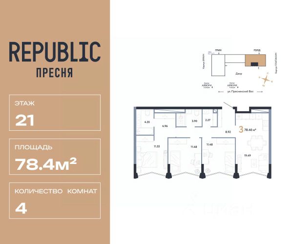 Продаётся 4 - комнатный пентхаус в готовом доме (Корпус 8), общей площадью 363.3 кв.м., на 21 этаже. О жилом комлексе Жилой квартал Lucky - это переосмысление и регенерация общественно-делового кластера площадью более 4.5 гектаров в центре Москвы. О застройщике Девелопер проекта Vesper специализируется в премиальном сегменте клубной жилой недвижимости. Портфель компании включает 22 проекта в Москве и странах Европы. Актуальные архитектурные проекты, индивидуальный дизайн, передовые технологии, качественные материалы и лучшие мировые практики воплощены в каждом доме компании. Расположение и транспортная доступность Квартал расположен на пересечении улиц 2-ая Звенигородская и Костикова, в 200 метрах от метро "Улица 1905 года". В непосредственной близости от парков, Москвы- реки, Сити и Садового кольца формируется идеальная среда для семейного проживания в мегаполисе. Архитектура Визуально квартал разделен на две части: верхний город с новыми высотными жилыми домами и нижний город с общественным пространством для инфраструктуры, где располагается новый социокультурный кластер площадью около 10 000 кв. м. Верхний город состоит из восьми жилых домов: семь 21-этажных башен и одно здание высотой 15 этажей. В восьми новых домах расположены 618 квартир. На каждом этаже 3-4 квартиры, большая часть которых имеет ориентацию на 2-3 стороны света. Из панорамных окон открываются виды на набережную Москва-реки, Сити и близлежащие парки. Знаковая архитектура, продуманные планировочные решения, изысканная отделка, инновационные инженерные решения воплощены в квартале Lucky. Инфраструктура В квартале представлена инфраструктура для всей семьи: парки и скверы, билингвальный детский сад La Berezka, собственный 600 м. игровой парк для детей, фитнес с подогреваемым бассейном на крыше, рестораны, кафе и магазины органических продуктов. В шаговой доступности от квартала расположены лучшие рейтинговые школы.