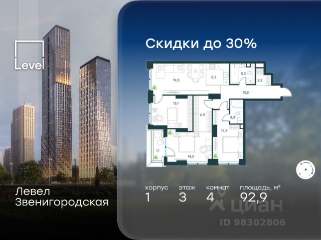 Цена указана с учётом скидки при 100%-й оплате, несубсидированной ипотеке, рассрочке (кроме программы "Рассрочка 0%"). В жилом квартале продаётся 4-комнатная квартира площадью 84.70 кв.м white box. Квартира расположена на 23 этаже 48 этажного корпуса 1 в жилом комплексе комфорт класса Левел Звенигородская (компания Level Group/Левел групп). Отличная транспортная доступность - 5 мин. пешком до метро "Звенигородская" (откроется к окончанию строительства); - 18 мин. пешком до станции МЦК "Хорошёво" и станции БКЛ "Народное ополчение"; - 4 мин. на авто до ТТК; - 8 мин. на авто до Садового кольца; - 15 мин. на авто до Кремля. Продуманный архитектурный проект - Концепция от студии Станислава Михаловского, в основу которой легло единение природы и города; - Двухкамерные стеклопакеты в окнах, алюминиевый и ПВХ профиль - в квартирах тепло зимой и прохладно летом; - С верхних этажей откроются панорамные виды на город, Москву-реку, "Москва-Сити" и Москворецкий парк; - Лобби со всеми удобствами: окна в пол, высокие потолки до 4,7 м, лаунж-зоны, колясочные, гостевые санузлы и мойки для лап животных; - Централизованные водонагреватели гарантируют круглогодичную подачу горячей воды в каждую квартиру. Благоустройство Концепция благоустройства разработана совместно с бюро UNK landscape. Высота башен приближается к 200 метрам - они словно касаются неба. Небесный простор проецируется на территорию двора с помощью подсветки, визуально увеличивая пространство и отражаясь в авторских элементах архитектуры. На территории площадью 0,45 га расположатся: - "Облако событий" - место встреч и общения; - "Облако спорта" - всё для поддержания себя в форме; - "Облако принятия решений" - пространство для работы на свежем воздухе; - "Облако спокойствия" - для отдыха в тишине природы; - "Облако игр" - площадки для подростков и самых маленьких. Инфраструктура В жилом комплексе откроется 21 коммерческое помещение: продуктовые лавки, кафе, салоны красоты, службы доставки и творческие студии. Этап 1 включает строительство двухуровневого подземного паркинга. Всего здесь расположится 351 машино-место, включая семейные места, и 264 кладовых помещения. В распоряжении жителей развитая инфраструктура района: 15 супермаркетов, 5 спортивных объектов, 9 медучреждений, 7 детских садов, 4 школы, 3 благоустроенных парка - всё в шаговой доступности. Инженерия Комфортное перемещение внутри домов будут обеспечивать надёжные лифты с доступом в паркинг с жилых этажей. В каждом корпусе предусмотрено до шести кабин, включая сервисные лифты. Попасть на территорию комплекса можно только по единому ключу доступа. Видеонаблюдение установлено на входах в подъезды, в лобби, в общих зонах, на въезде в паркинг. Гости смогут связаться с жителями дома через входные видеопанели, а управлять доступом на территорию можно через видеодомофон или приложение на телефоне.