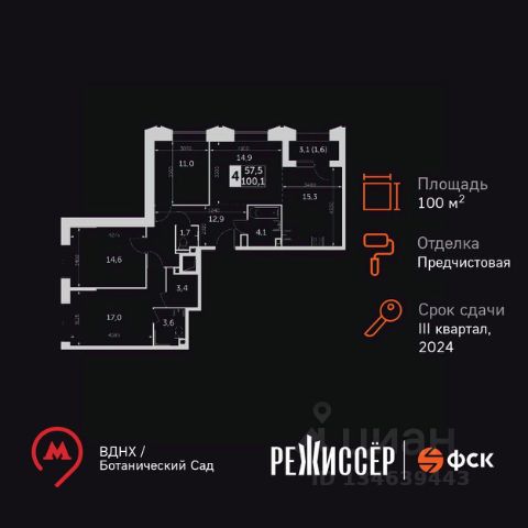 Указанная акционная стоимость доступна при 100% оплате или ипотеке без субсидирования. Цена действует до 31.12.2025 23:59:59. Стоимость без акции 41313600. Продаётся 4-комнатная квартира общей площадью 90.60 кв. м на 2 этаже жилого квартала бизнес-класса iLove. Предчистовая отделка, 2 санузла. Мастер-спальня с гардеробной. Просторная кухня-гостиная. Ниша для гардеробной. Окна в квартире выходят на разные стороны Вид: • во двор Жилой квартал iLove расположен в тихом зеленом районе Останкино. До метро "Алексеевская" всего 10 минут пешком, а на автомобиле можно добраться до ТТК за 6 минут. iLove состоит из 5 корпусов переменной этажности — каждый корпус которых имеет вертикальные высотные и среднеэтажные горизонтальные фасады. Из окон большинства квартир открываются прекрасные виды на Останкино. Для удобства жильцов предусмотрены подземная и гостевая парковки, а внутренняя территория комплекса свободна от машин. Благоустроенный двор с детскими и спортивными площадками и дизайнерский подъезд с панорамными окнами создают приятную атмосферу для жизни. В проекте реализуется концепция "город в городе" — вся необходимая инфраструктура расположена на первых этажах зданий, запроектирован комьюнити-центр (общественное пространство для отдыха и досуга жителей квартала). В 2025 году на территории жилого комплекса запланировано открытие детского сада. В пешей доступности находятся продуктовые магазины, кафе и рестораны, школы и поликлиники. В ближайшем окружении крупные парки — ВДНХ, парк "Останкино", Ботанический сад, Сокольники.
