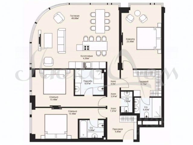 Планировка включает кухню-гостиную с выходом на террасу, 3 спальни с отдельными санузлами, гардеробную, холл, гостевой санузел и зону постирочной. Благодаря панорамному остеклению пространство наполнено естественным светом и теплом.