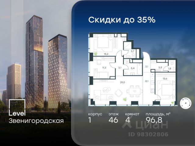 Цена указана с учётом скидки при 100%-й оплате, несубсидированной ипотеке, рассрочке (кроме программы "Рассрочка 0%"). В жилом квартале продаётся 4-комнатная квартира площадью 101.80 кв.м white box. Квартира расположена на 5 этаже 48 этажного корпуса 1 в жилом комплексе комфорт класса Level Звенигородская (компания Level Group/Левел групп). Отличная транспортная доступность - 5 мин. пешком до метро "Звенигородская" (откроется к окончанию строительства); - 18 мин. пешком до станции МЦК "Хорошёво" и станции БКЛ "Народное ополчение"; - 4 мин. на авто до ТТК; - 8 мин. на авто до Садового кольца; - 15 мин. на авто до Кремля. Продуманный архитектурный проект - Концепция от студии Станислава Михаловского, в основу которой легло единение природы и города; - Двухкамерные стеклопакеты в окнах, алюминиевый и ПВХ профиль - в квартирах тепло зимой и прохладно летом; - С верхних этажей откроются панорамные виды на город, Москву-реку, "Москва-Сити" и Москворецкий парк; - Лобби со всеми удобствами: окна в пол, высокие потолки до 4,7 м, лаунж-зоны, колясочные, гостевые санузлы и мойки для лап животных; - Централизованные водонагреватели гарантируют круглогодичную подачу горячей воды в каждую квартиру. Благоустройство Концепция благоустройства разработана совместно с бюро UNK landscape. Высота башен приближается к 200 метрам - они словно касаются неба. Небесный простор проецируется на территорию двора с помощью подсветки, визуально увеличивая пространство и отражаясь в авторских элементах архитектуры. На территории площадью 0,45 га расположатся: - "Облако событий" - место встреч и общения; - "Облако спорта" - всё для поддержания себя в форме; - "Облако принятия решений" - пространство для работы на свежем воздухе; - "Облако спокойствия" - для отдыха в тишине природы; - "Облако игр" - площадки для подростков и самых маленьких. Инфраструктура В жилом комплексе откроется 21 коммерческое помещение: продуктовые лавки, кафе, салоны красоты, службы доставки и творческие студии. Этап 1 включает строительство двухуровневого подземного паркинга. Всего здесь расположится 351 машино-место, включая семейные места, и 264 кладовых помещения. В распоряжении жителей развитая инфраструктура района: 15 супермаркетов, 5 спортивных объектов, 9 медучреждений, 7 детских садов, 4 школы, 3 благоустроенных парка - всё в шаговой доступности. Инженерия Комфортное перемещение внутри домов будут обеспечивать надёжные лифты с доступом в паркинг с жилых этажей. В каждом корпусе предусмотрено до шести кабин, включая сервисные лифты. Попасть на территорию комплекса можно только по единому ключу доступа. Видеонаблюдение установлено на входах в подъезды, в лобби, в общих зонах, на въезде в паркинг. Гости смогут связаться с жителями дома через входные видеопанели, а управлять доступом на территорию можно через видеодомофон или приложение на телефоне.